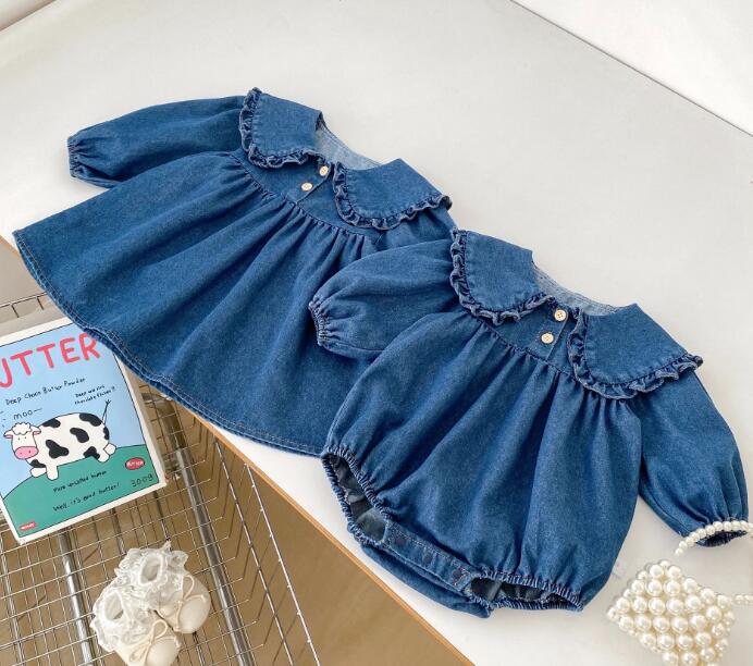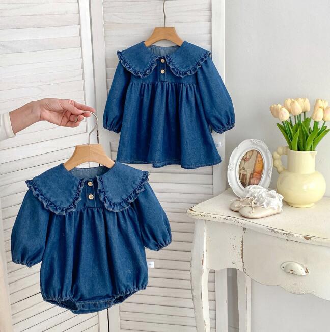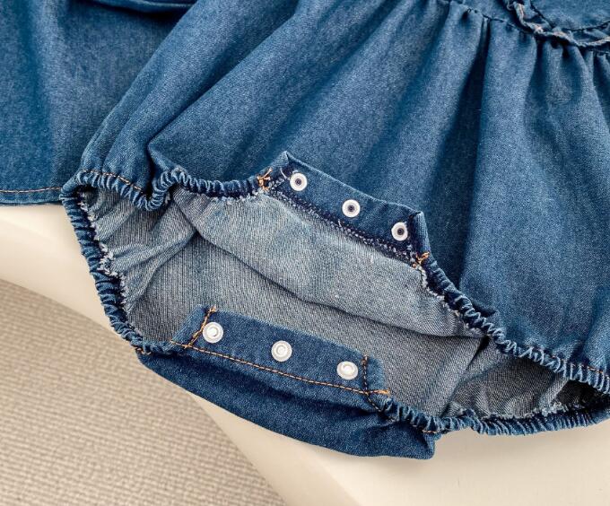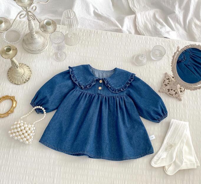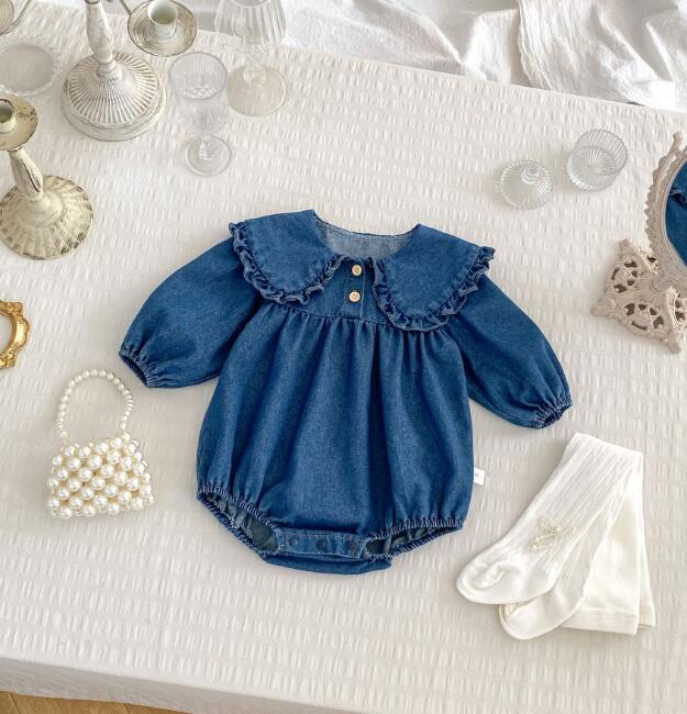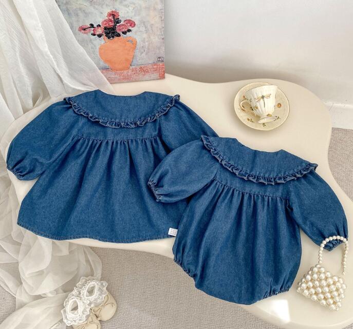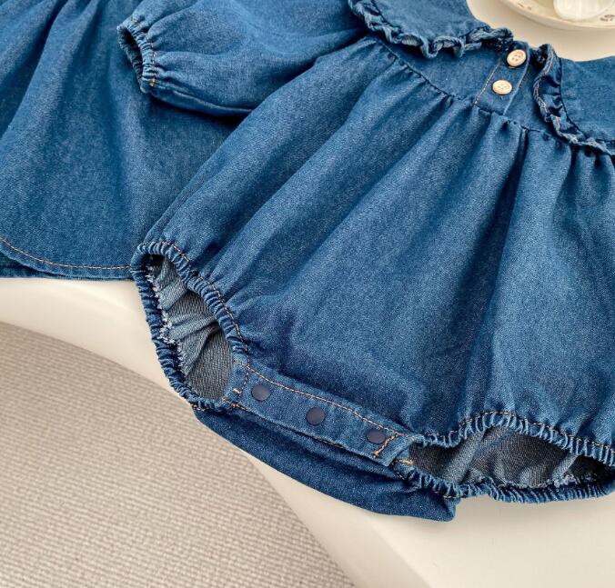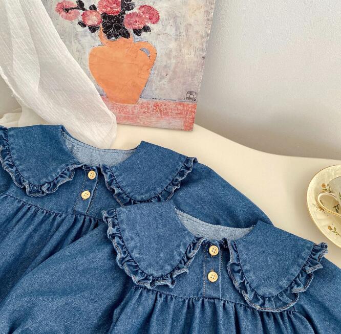 可愛い襟フリルが特徴的な韓国風キッズデニム服の2点セット。