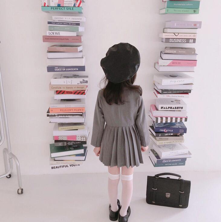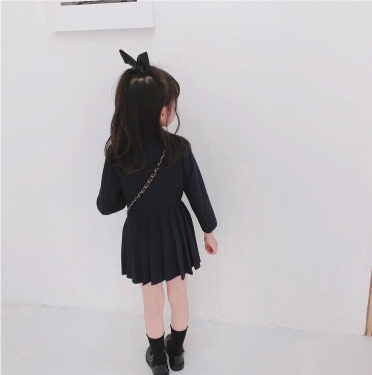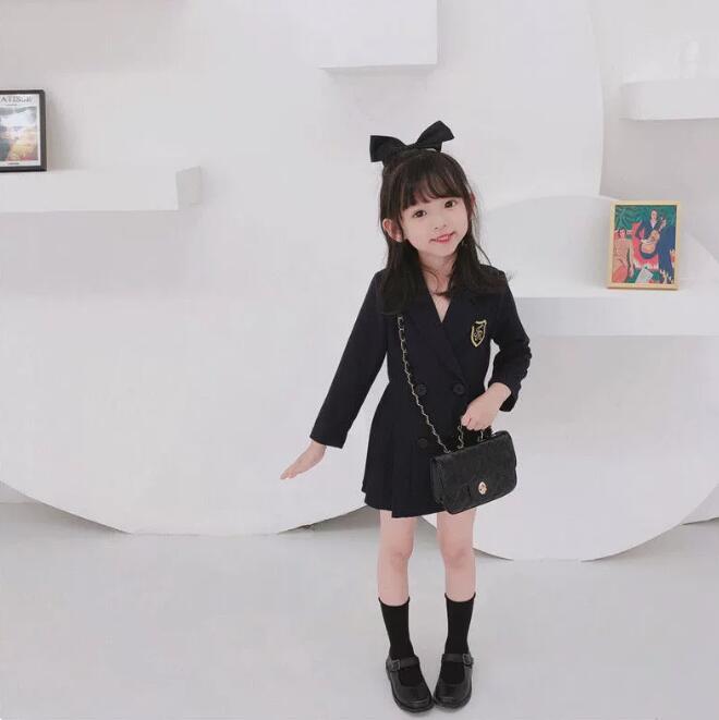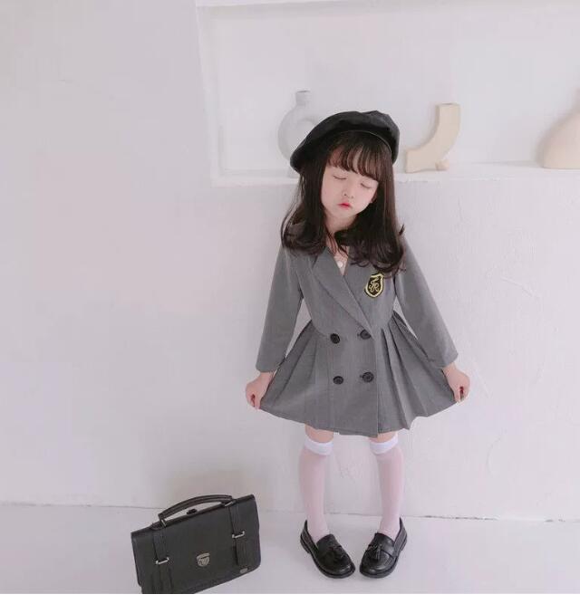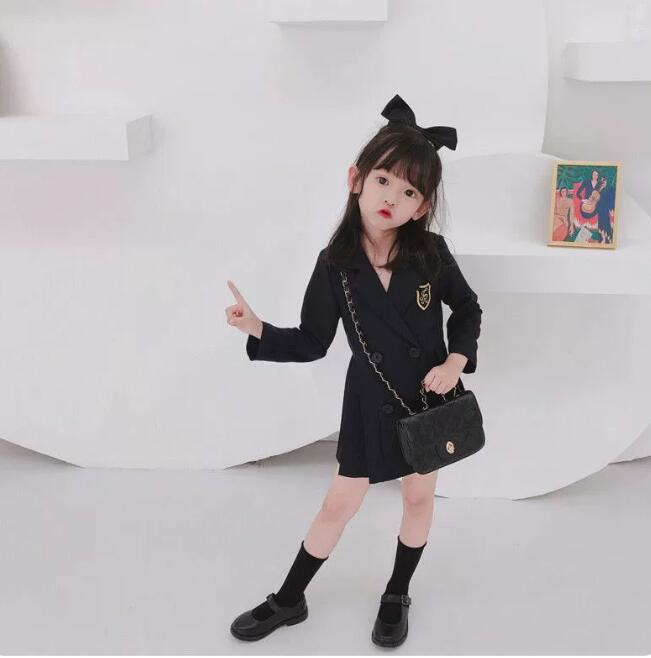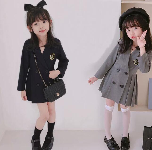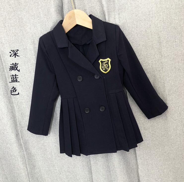 韓国風のおしゃれなデザインで、エンブレム付きジャケットとプリーツスカートの上品なセットアップ。