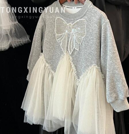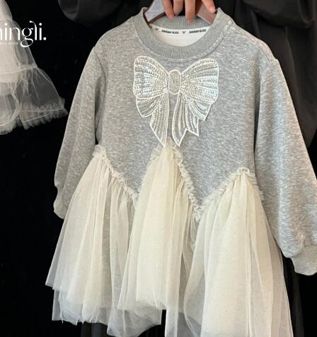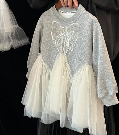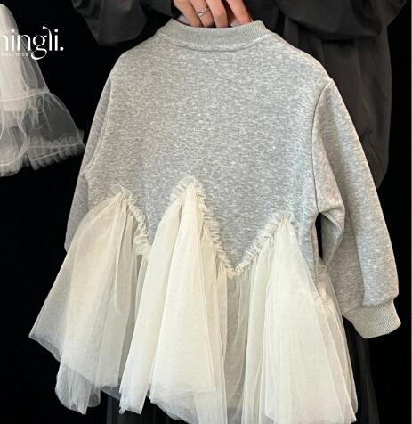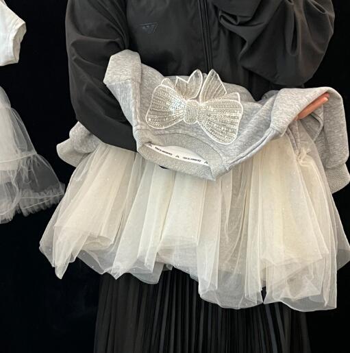グレーのトップスに白いチュールスカートが組み合わさった上品なデザイン。