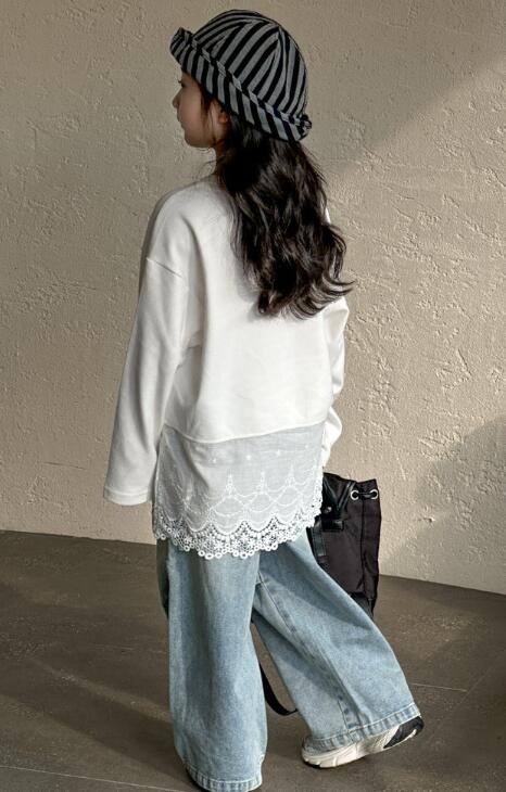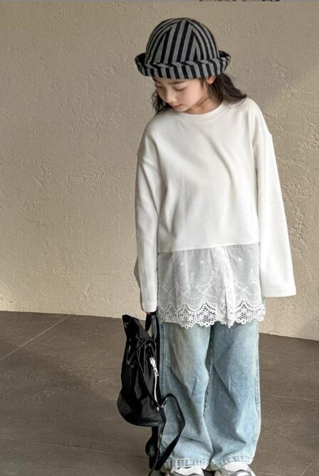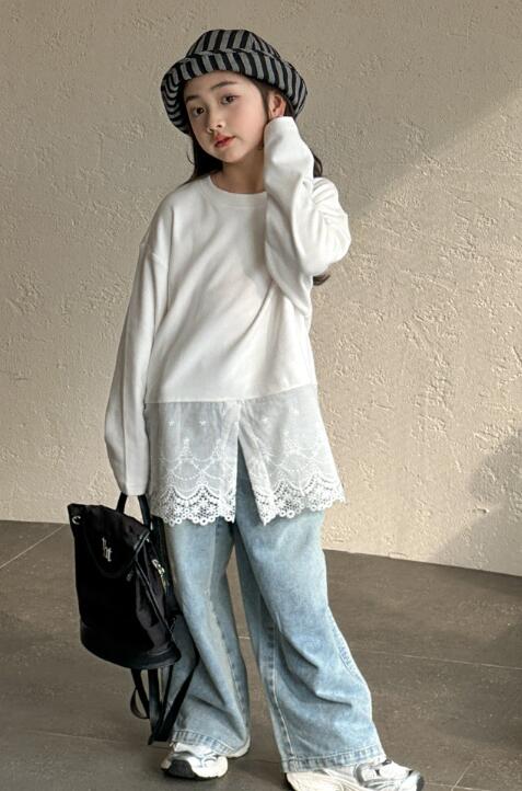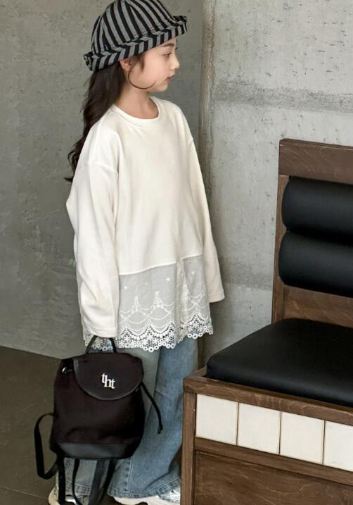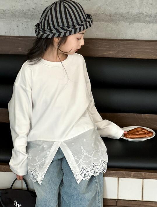 韓国風デザインの長袖ワンピースで、裾のレース切替がとても上品な仕上がり。