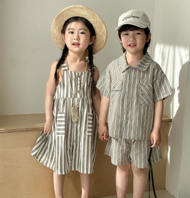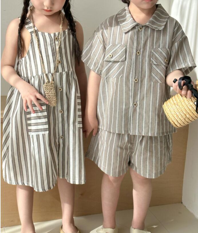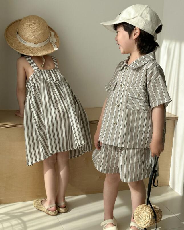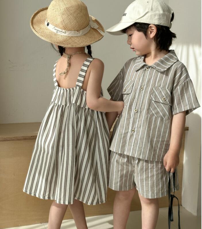 姉妹にはゆったりとしたロングワンピース、兄弟には襟付きシャツとハーフパンツをご用意。