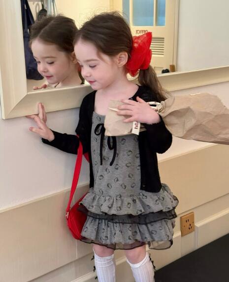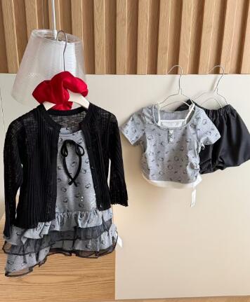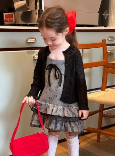 おしゃれなキッズ向けロングワンピースとカーディガンのセット商品です。