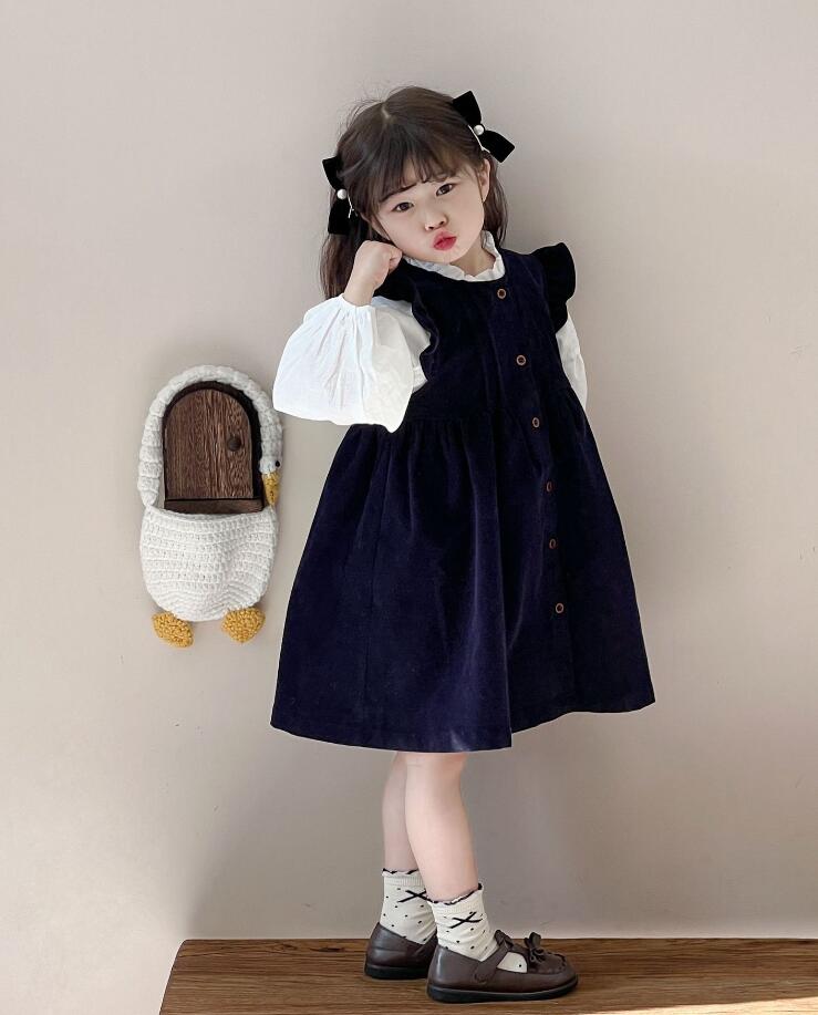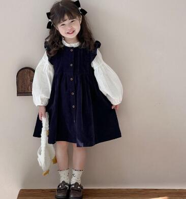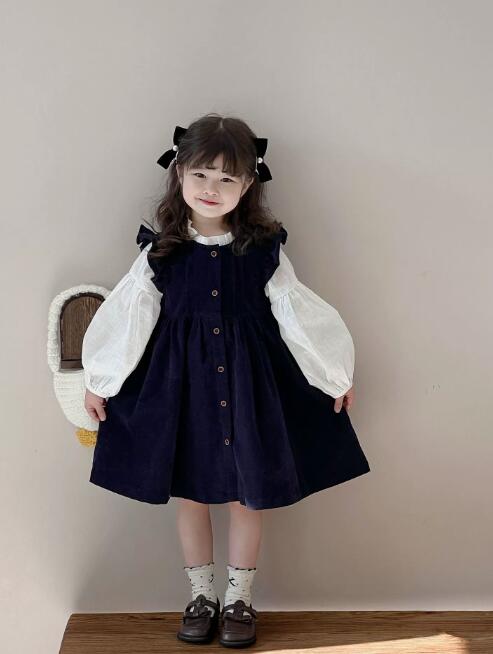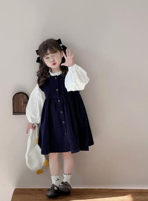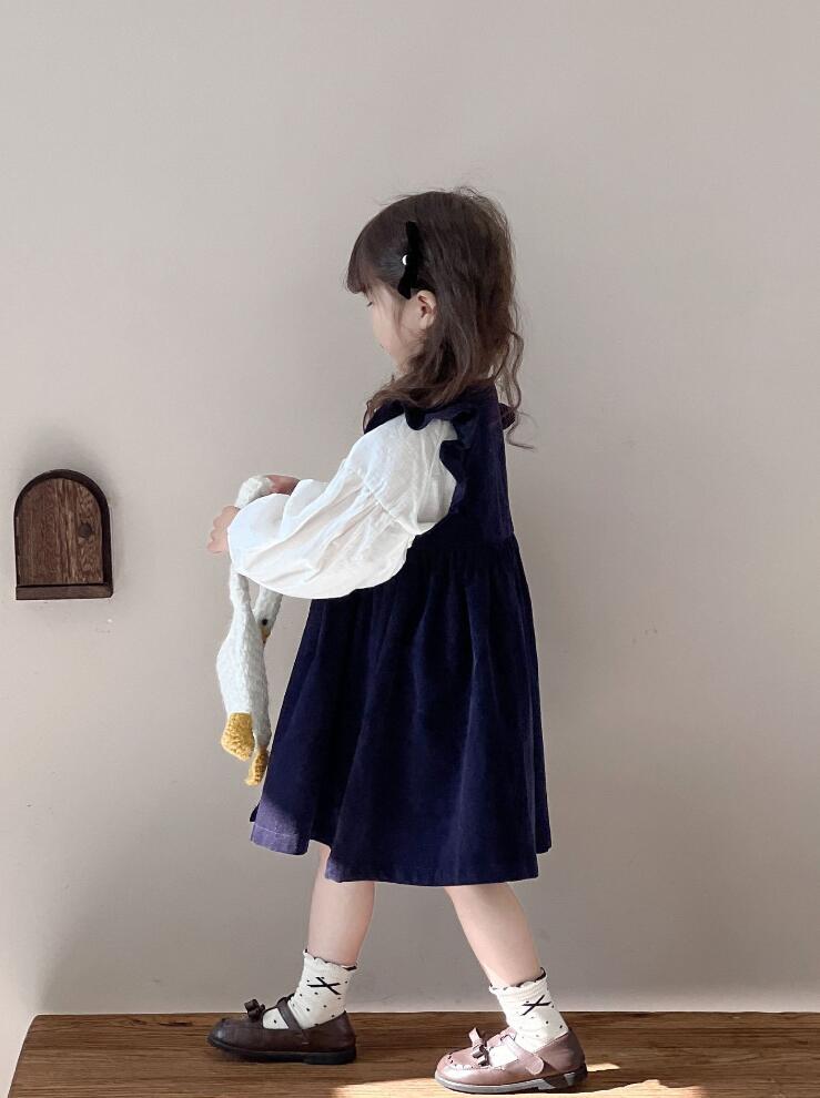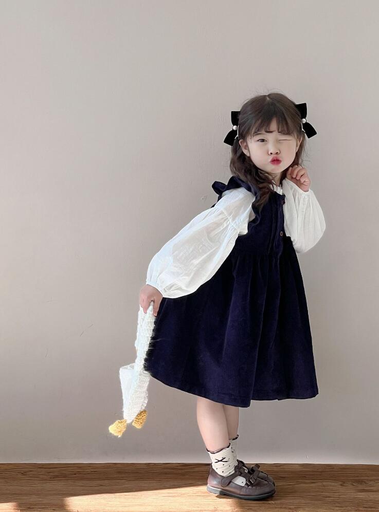 白いパフスリーブブラウスと紺色のジャンパースカートの組み合わせで、