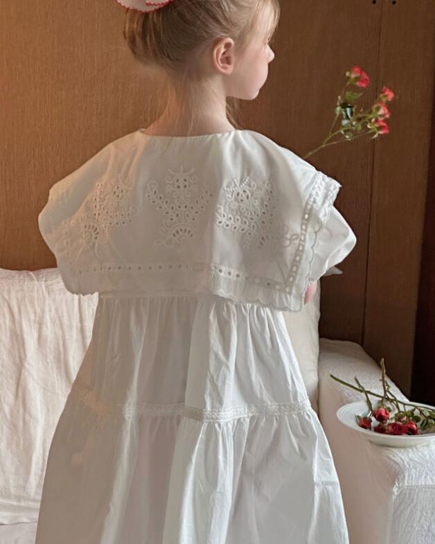 上品な白色生地に美しいレース襟がアクセントの可愛らしいデザイン。