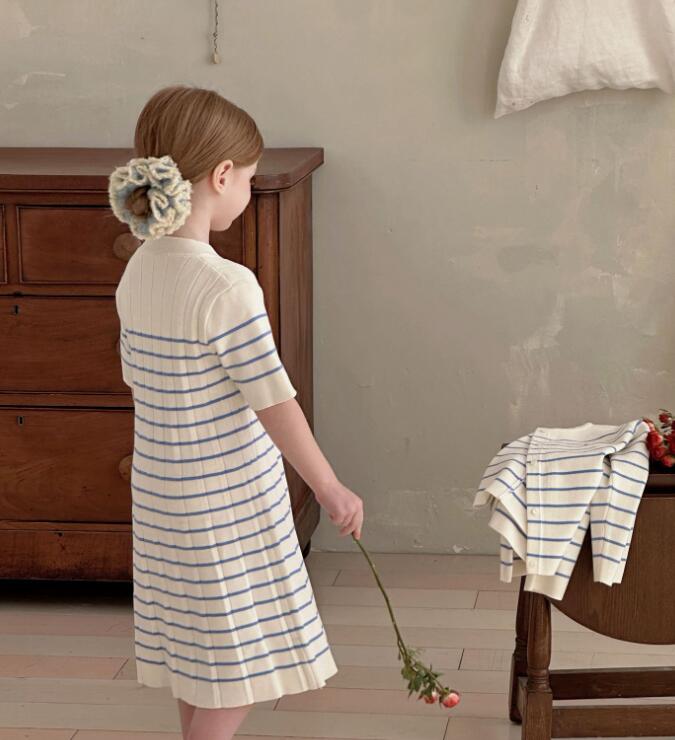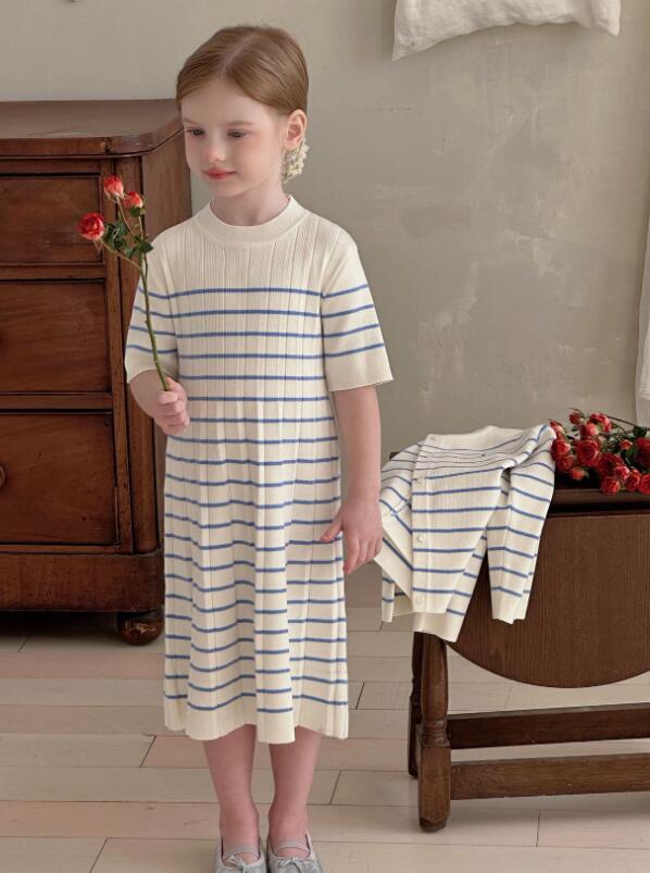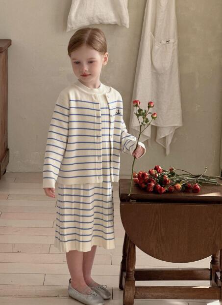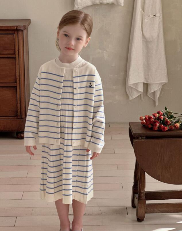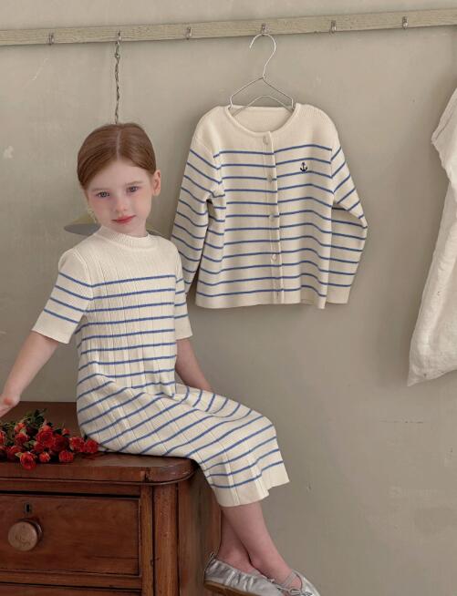 上品な青ボーダーが可愛いキッズ用ロングワンピースとカーディガンのセットです。