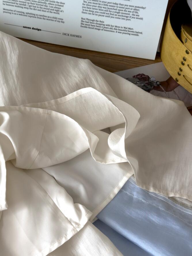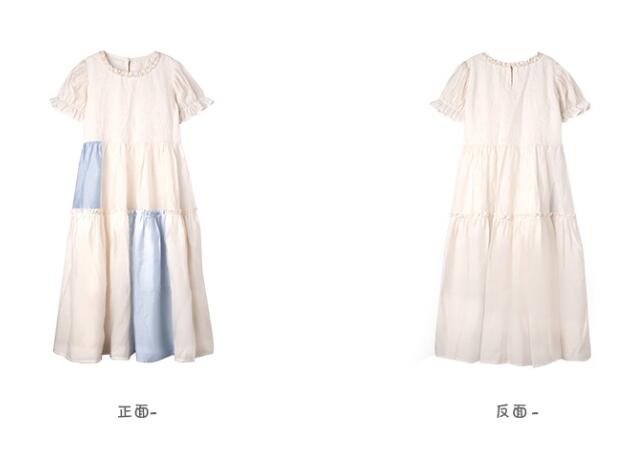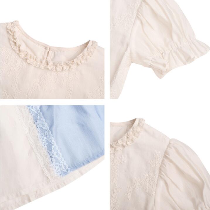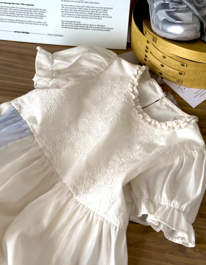 白とブルーの配色が爽やかで、丸襟デザインが女の子らしさを演出します。