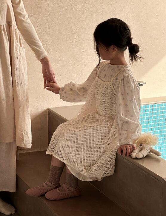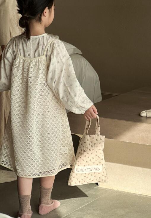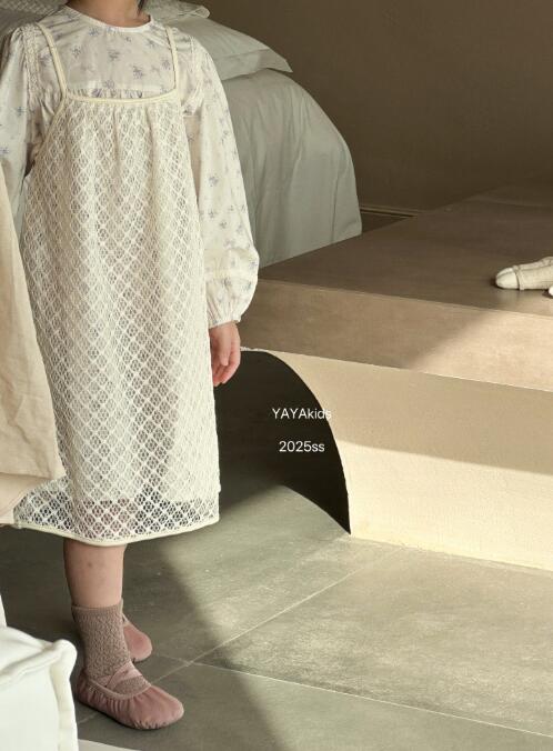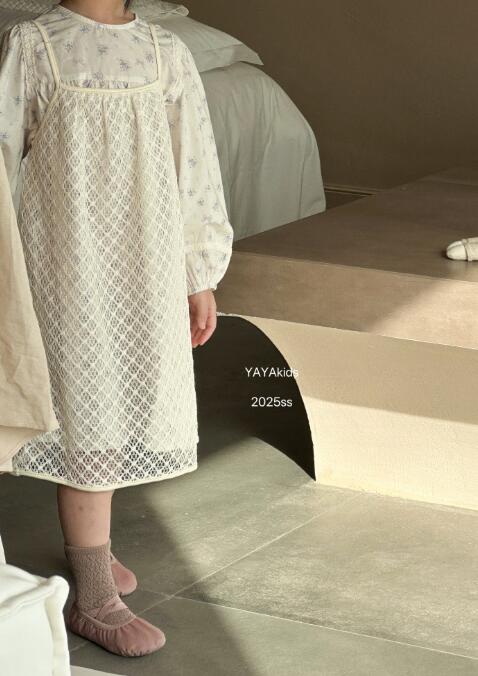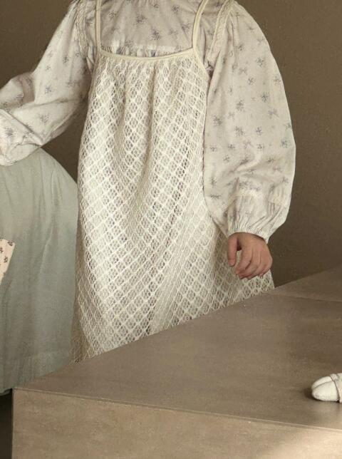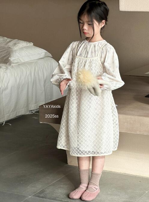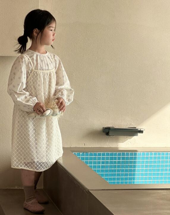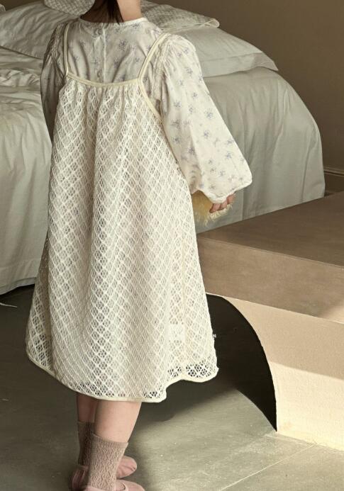 キッズに人気の韓国風ロングワンピースとレーストップスの2点セット。