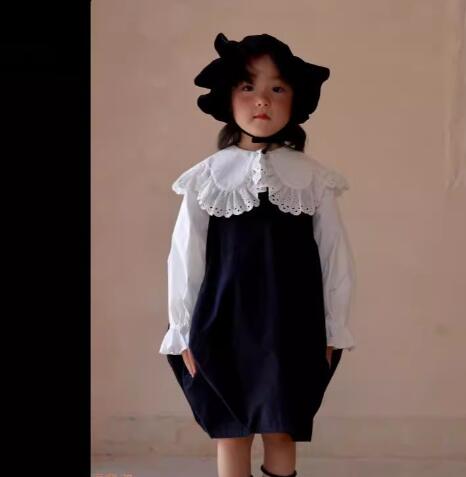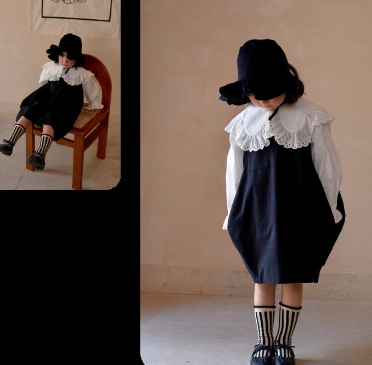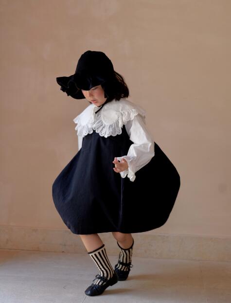 白いブラウスと紺色のサスペンダーワンピースの組み合わせで、