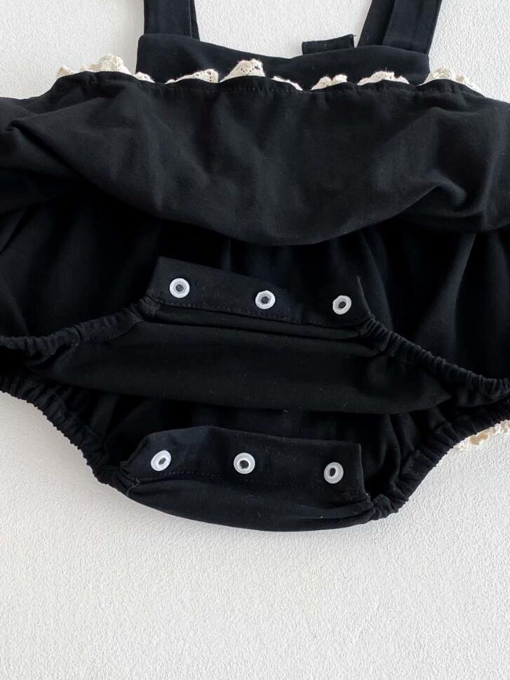 白いブラウスとジャンパースカートの上品なセットアップで、レース装飾が女の子らしさを演出します。