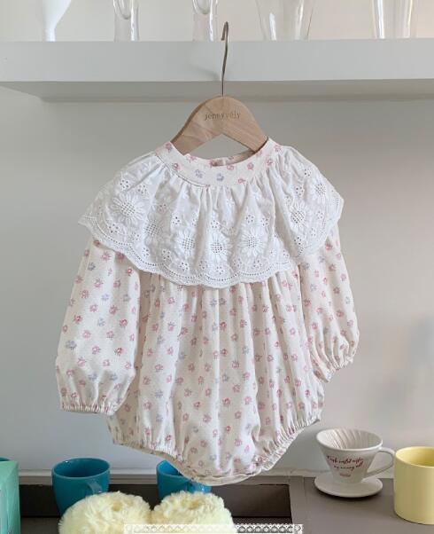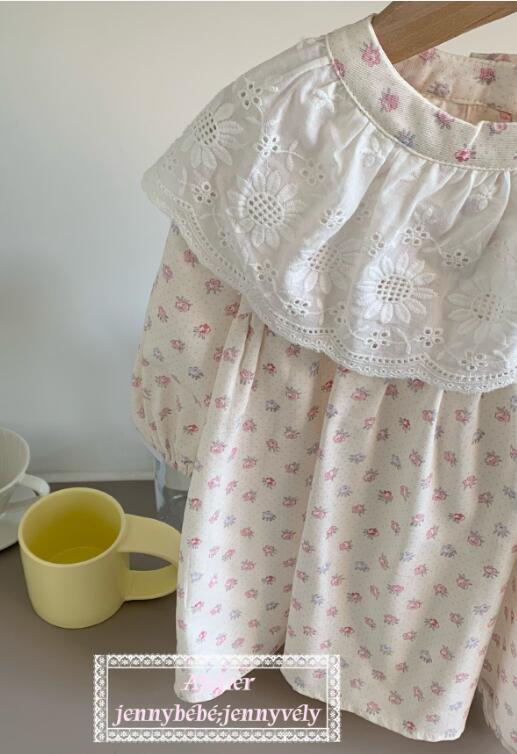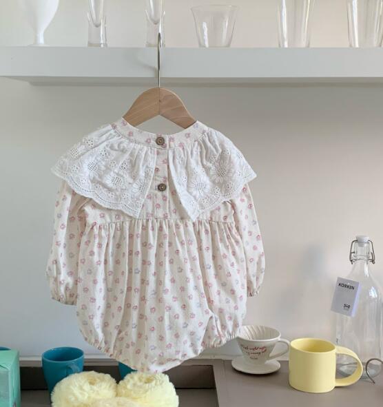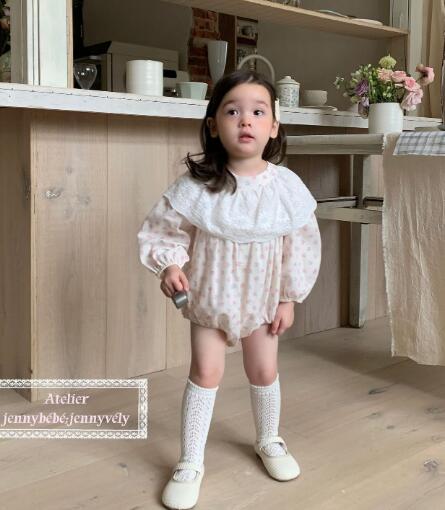 上品な白いレース襟が印象的なキッズ用花柄ロンパースです。