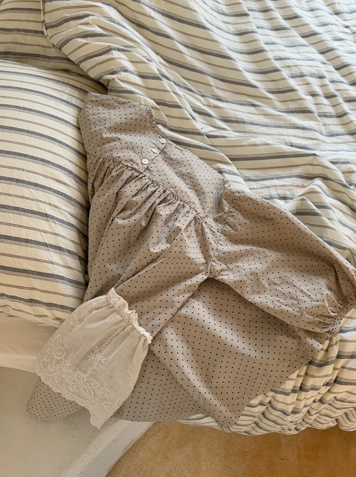 裾のレース装飾がエレガントな印象を演出し、長袖デザインで季節の変わり目にも最適です。