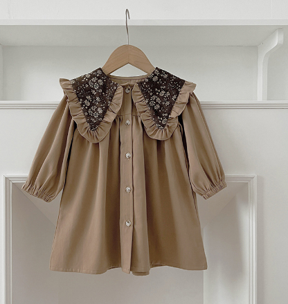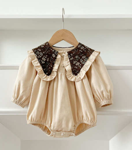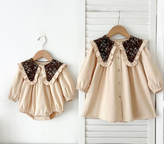 ベージュカラーのロングワンピースとロンパースで、姉妹コーディネートが楽しめます。