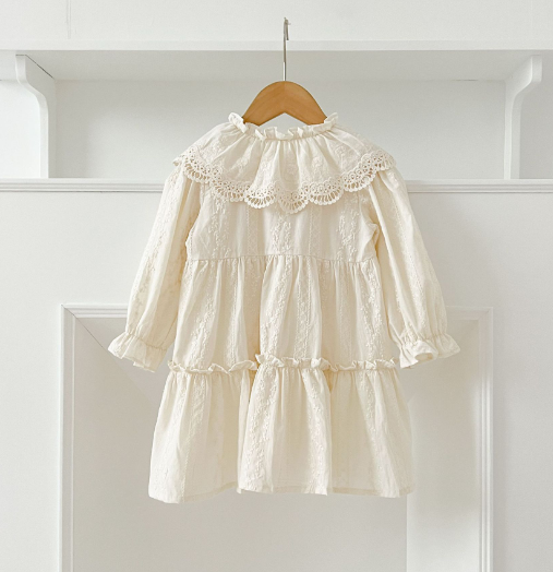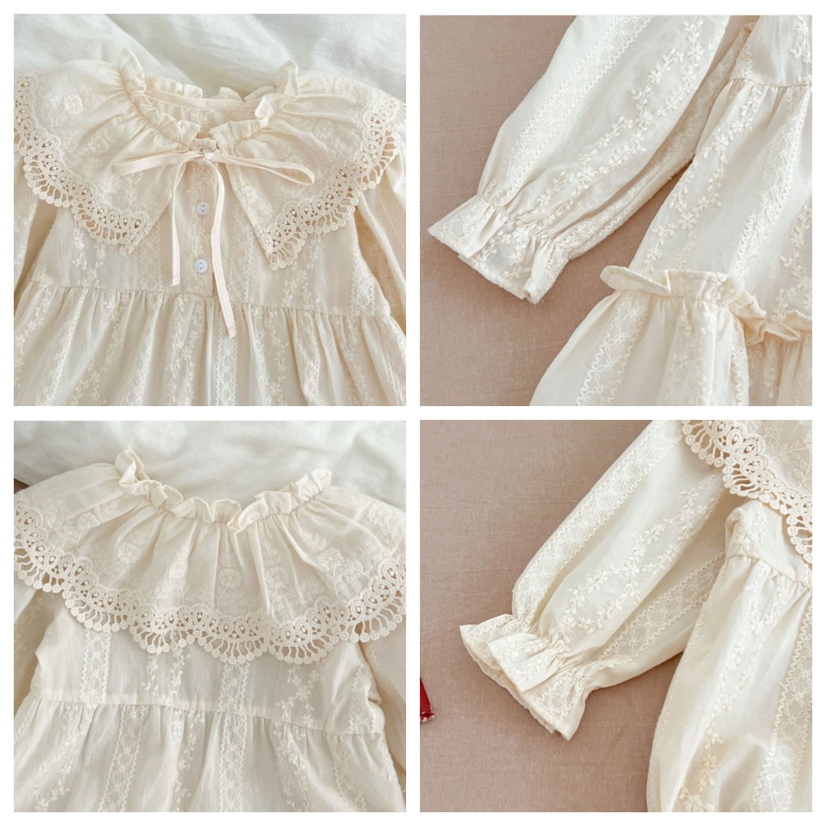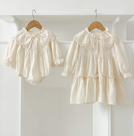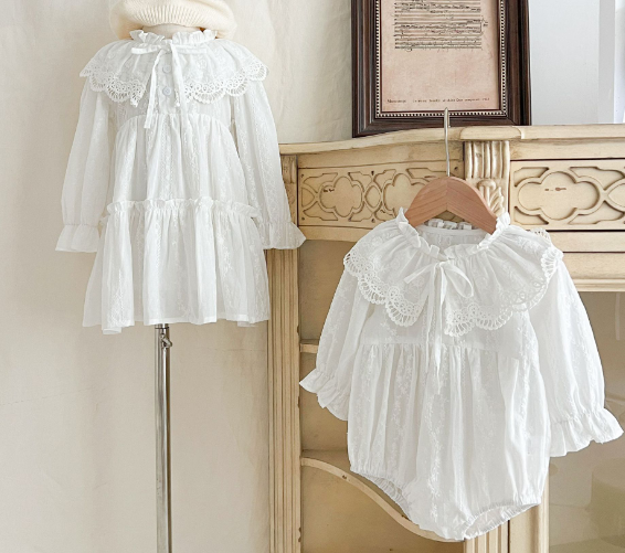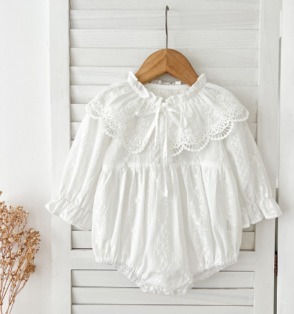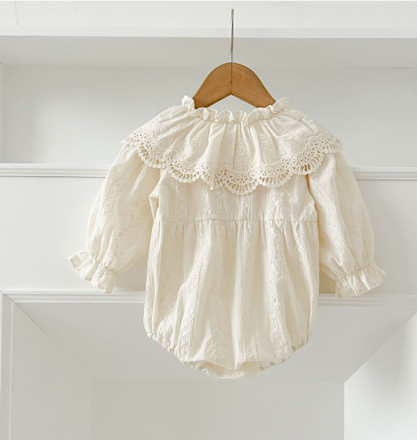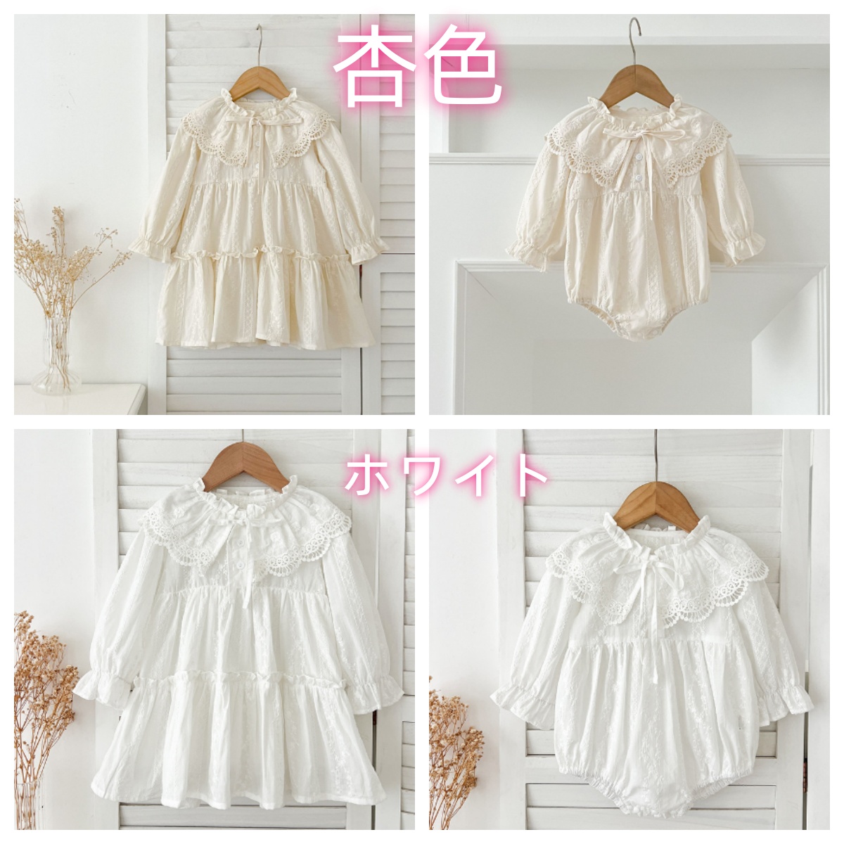 繊細なレース襟とふんわり袖が特徴的なロンパースと、