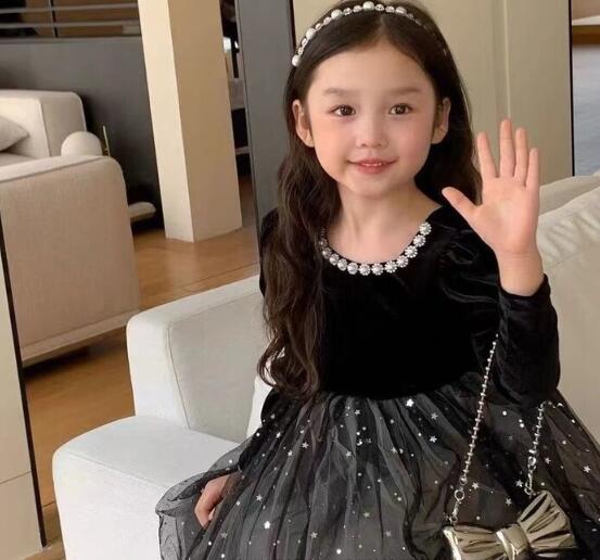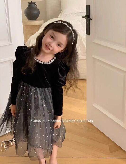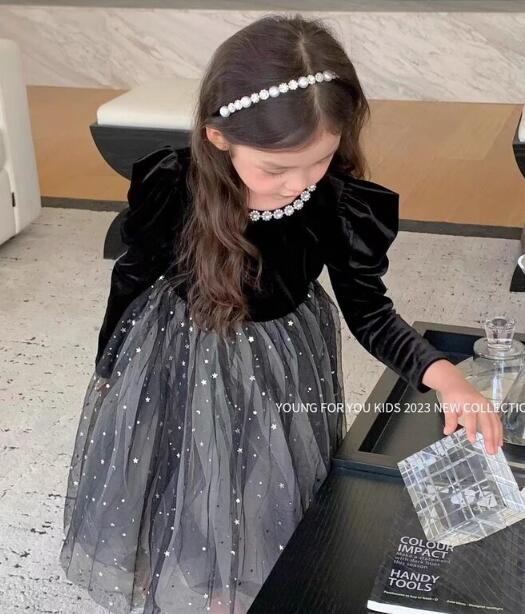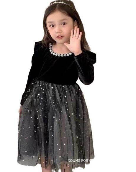 上品な黒のベルベット生地に星柄チュールスカートを組み合わせた特別な一着。