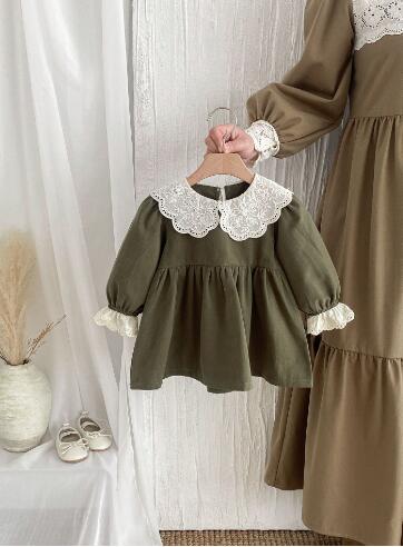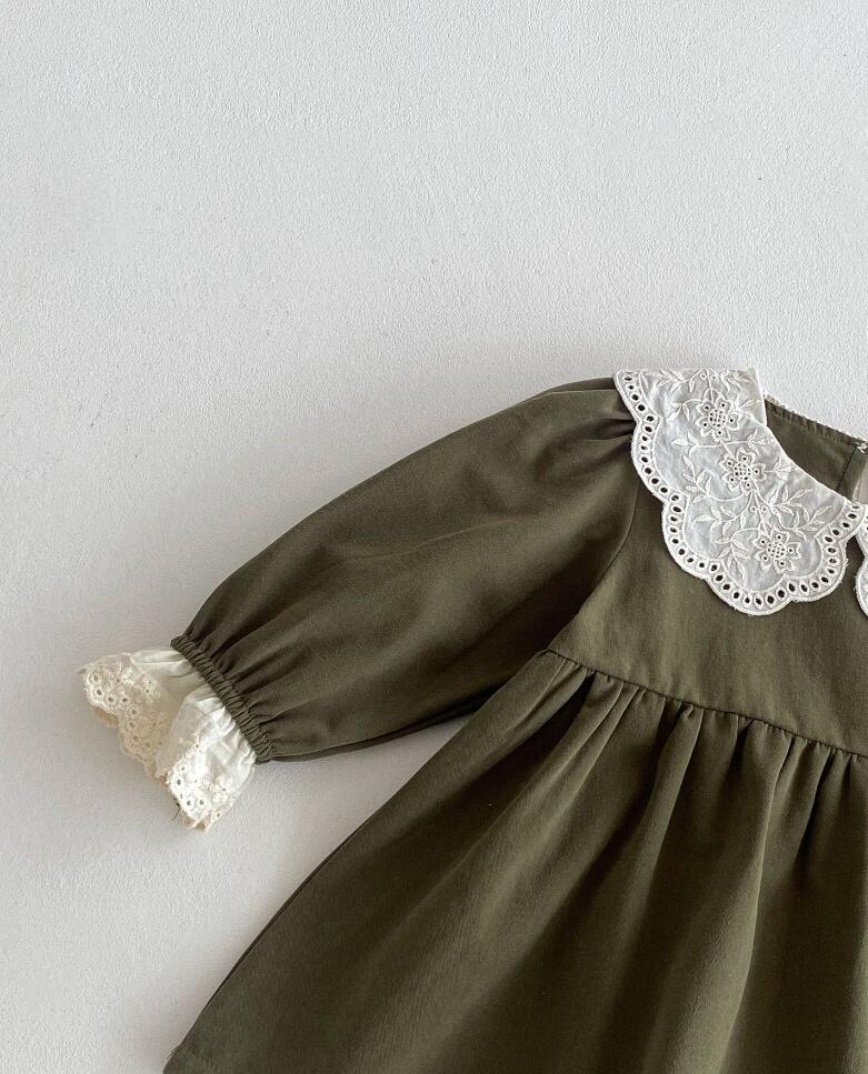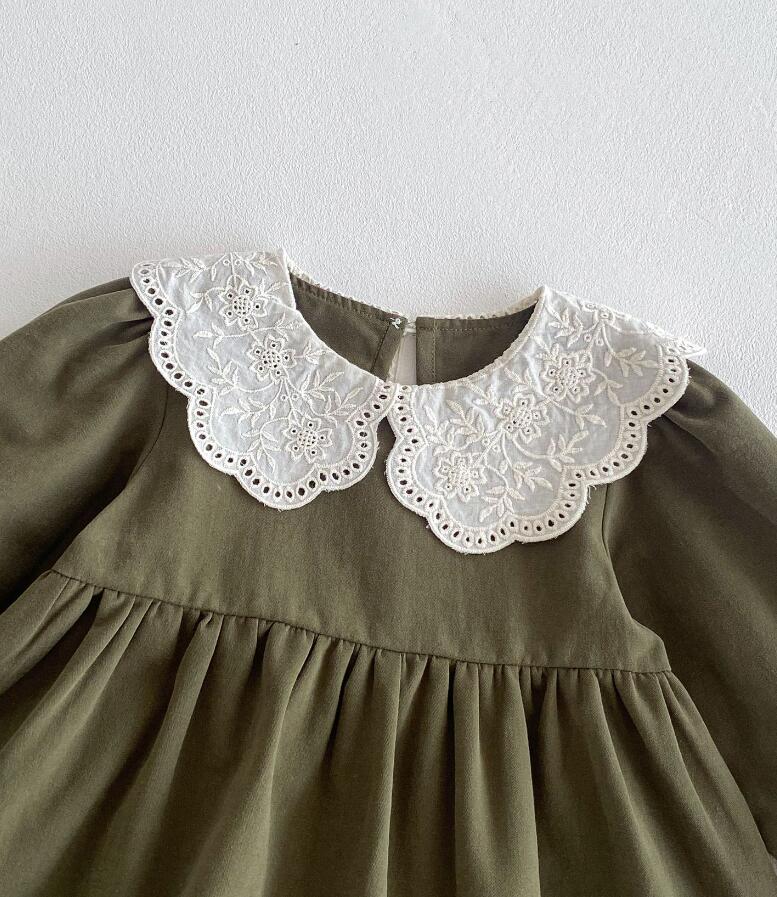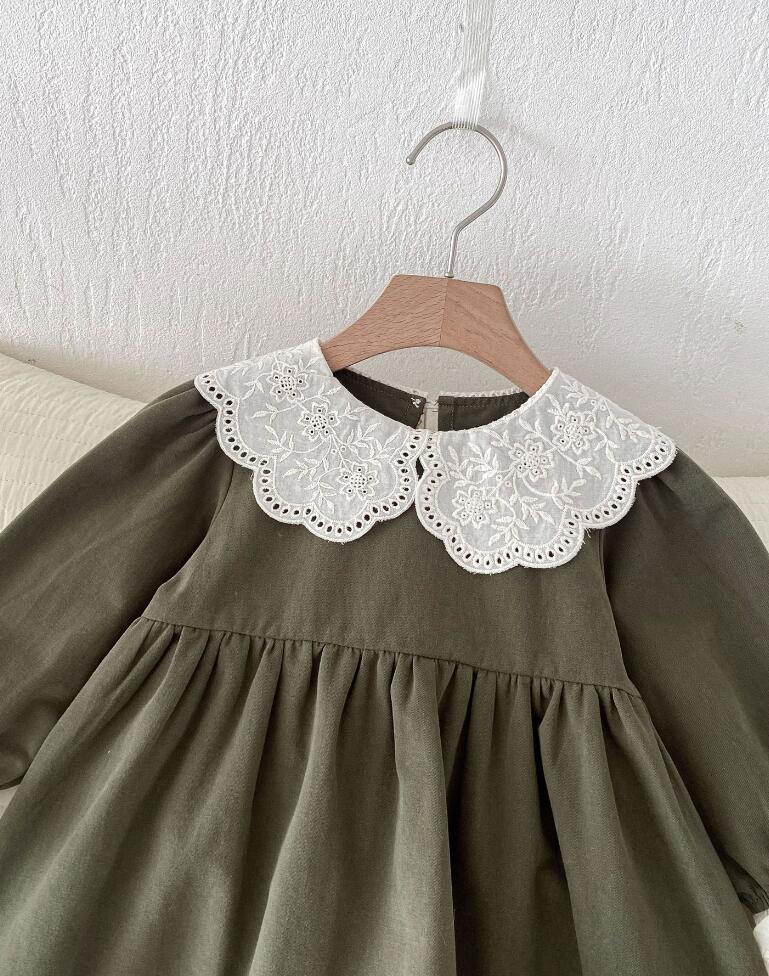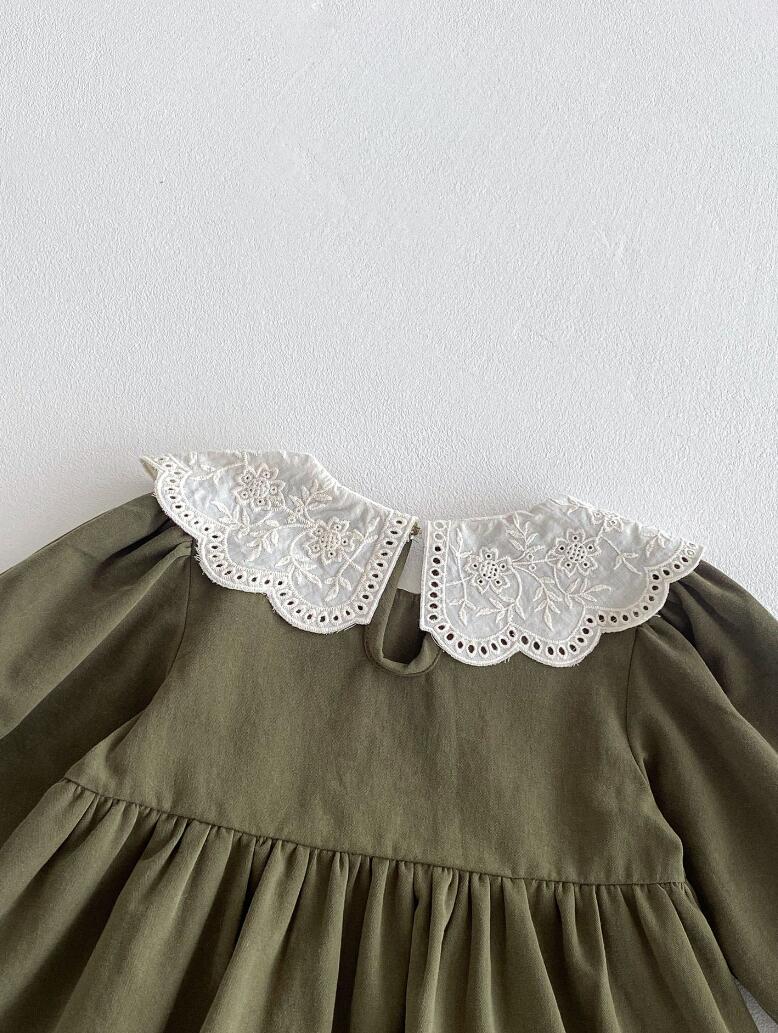可愛らしい白い襟がポイントのキッズ向けロングワンピースです。