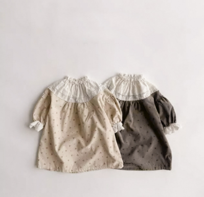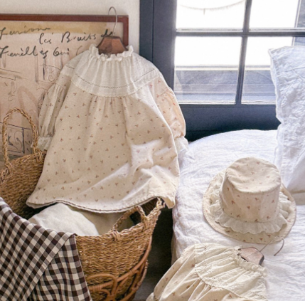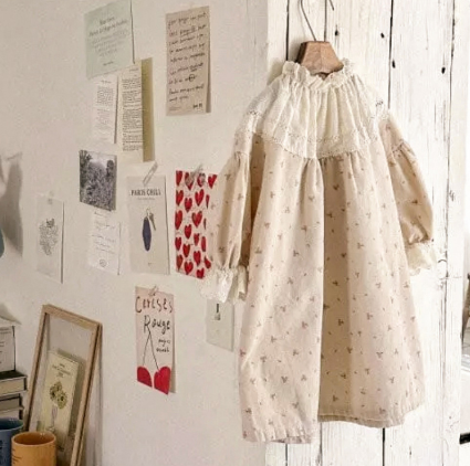 柔らかな素材で作られた長袖ワンピースは小花柄が上品で、フリル襟がとても愛らしいデザイン。