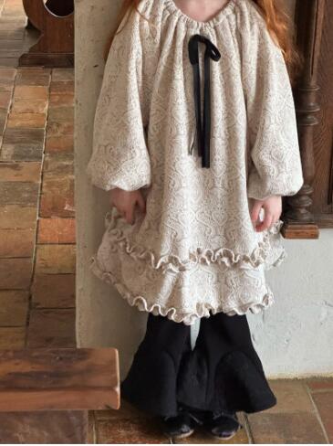 胸元の黒いリボンがアクセントになり、フリル袖とレース裾が可愛らしさを演出します。
