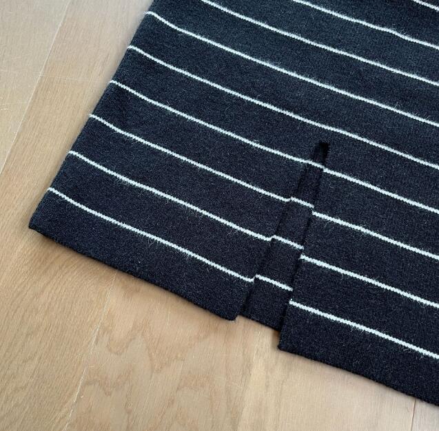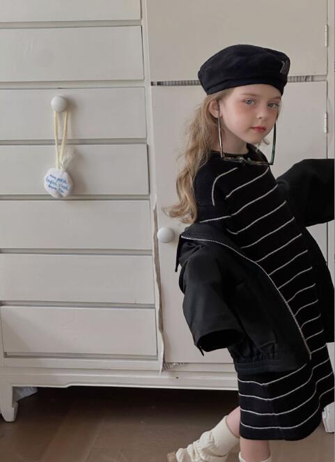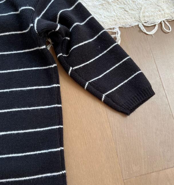 黒地に白いストライプが映える上品なデザインで、ロングワンピースとして一枚でコーディネートが完成します。