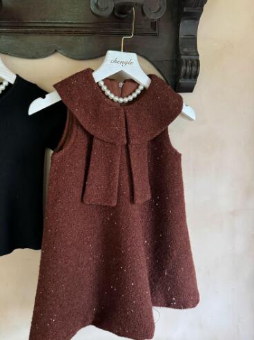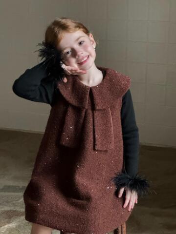 上品なブラウンカラーに可愛い丸襟とリボンデザインが特徴的。