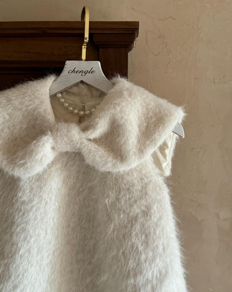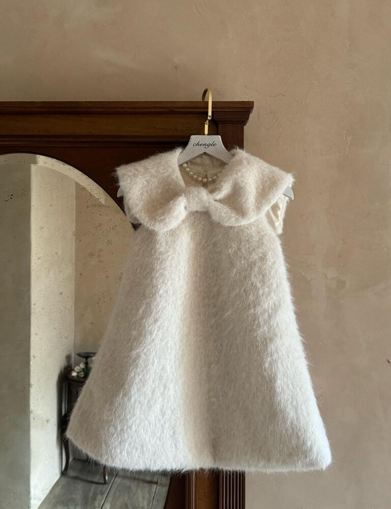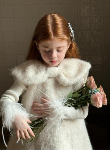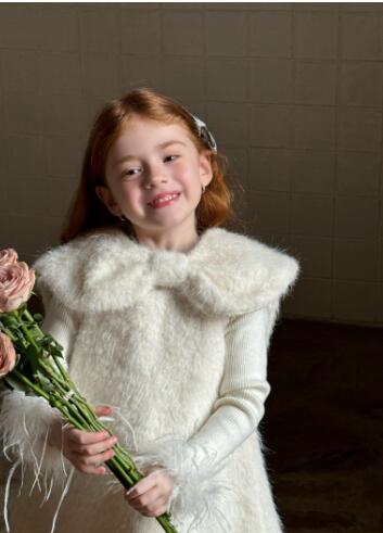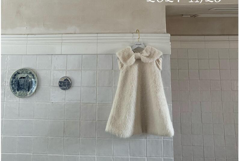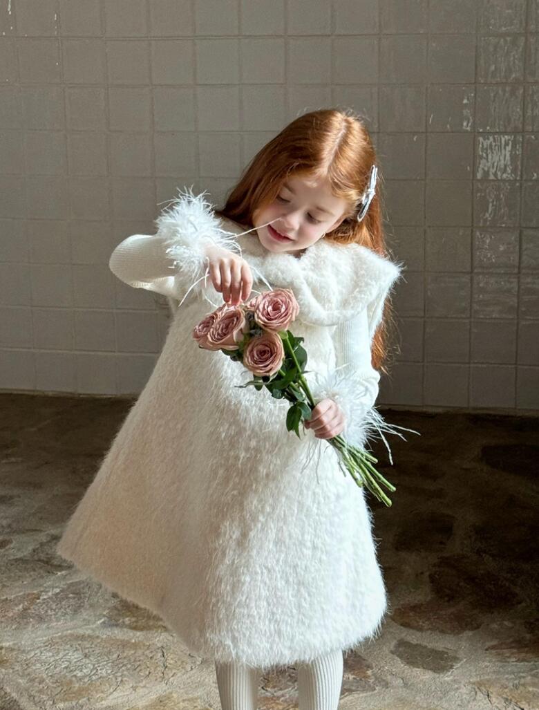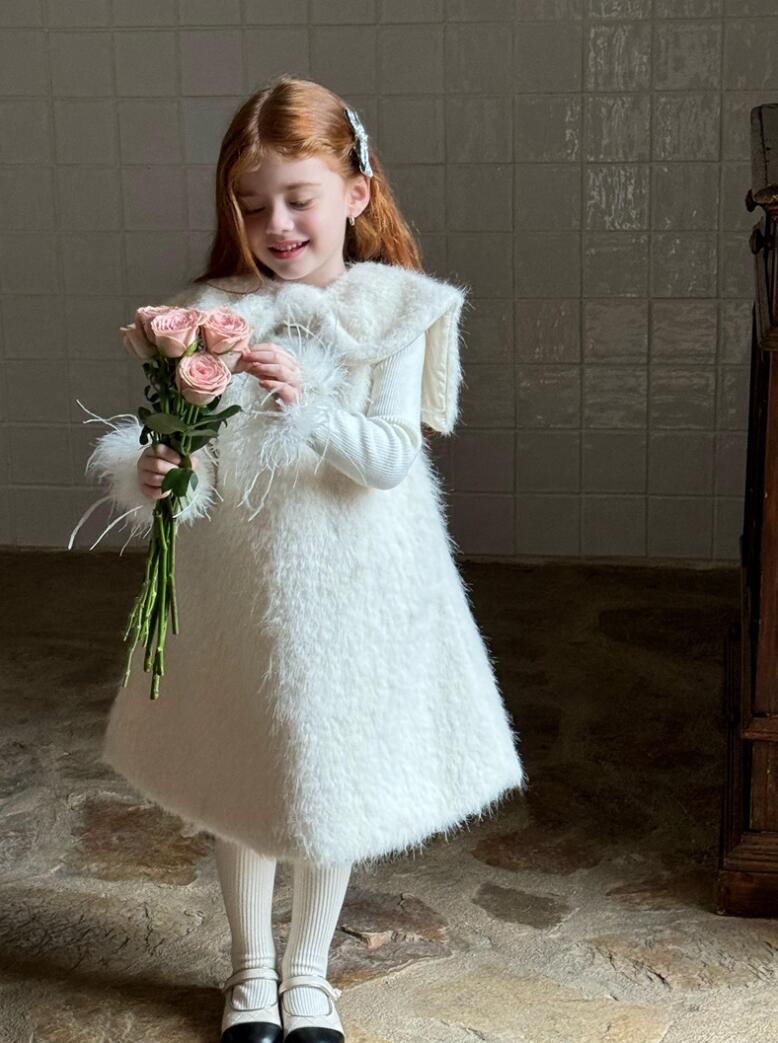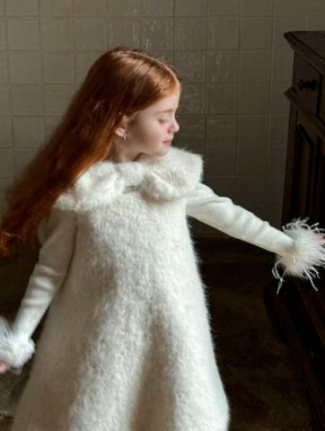 ふわふわした素材が可愛らしいキッズ用の白色ロングワンピースです。