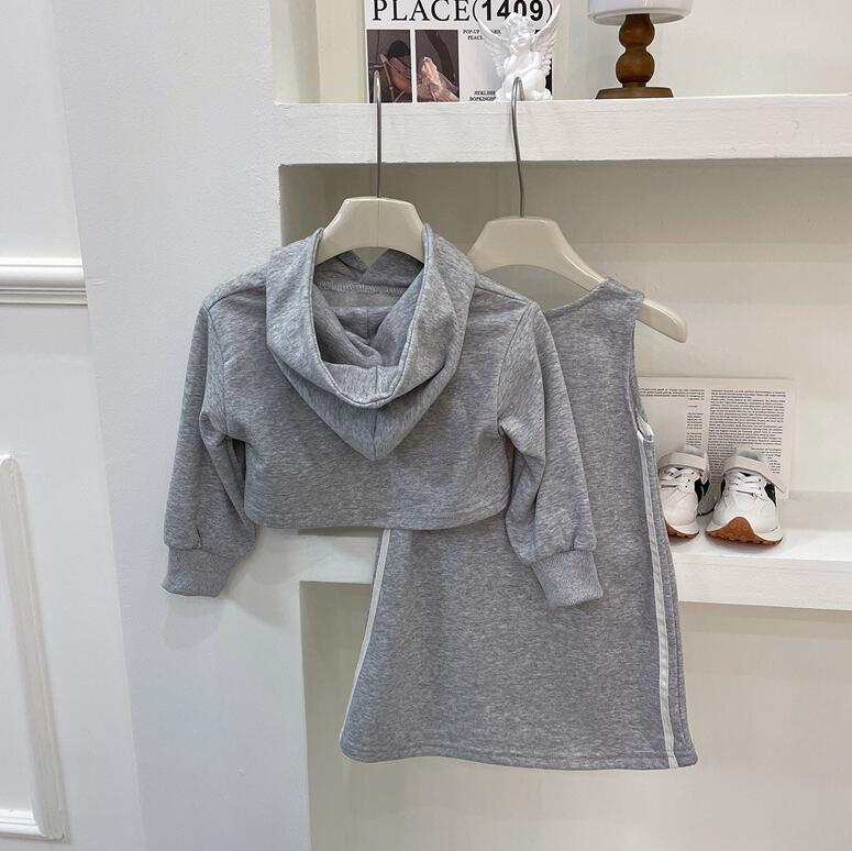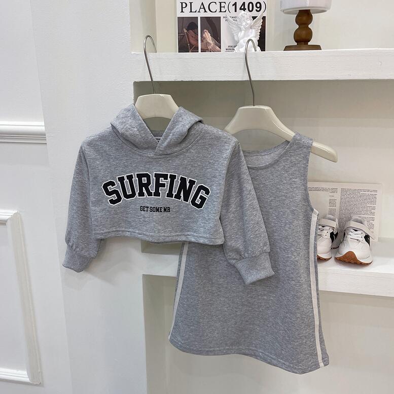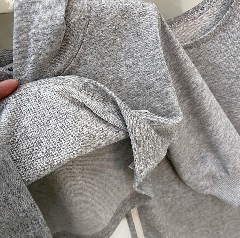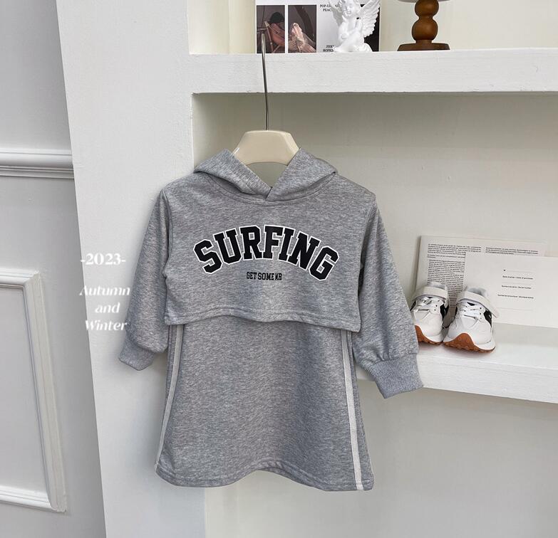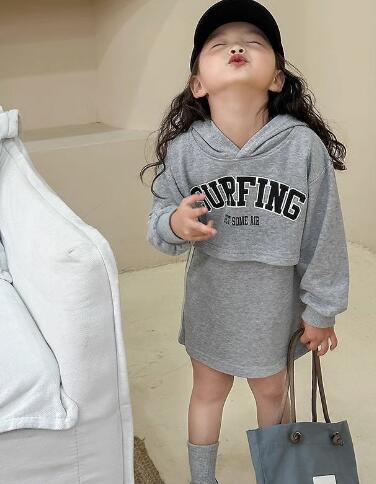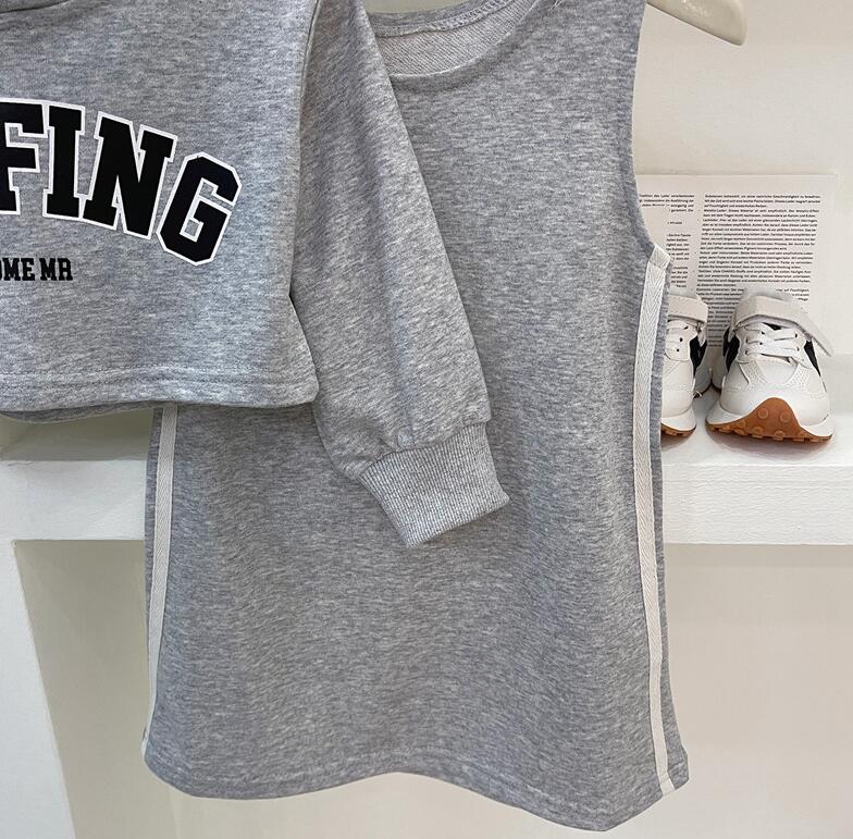 柔らかなグレー生地の長袖パーカーとロングワンピースの組み合わせで、