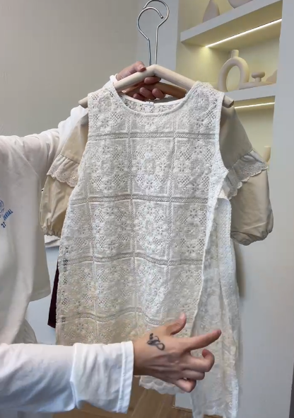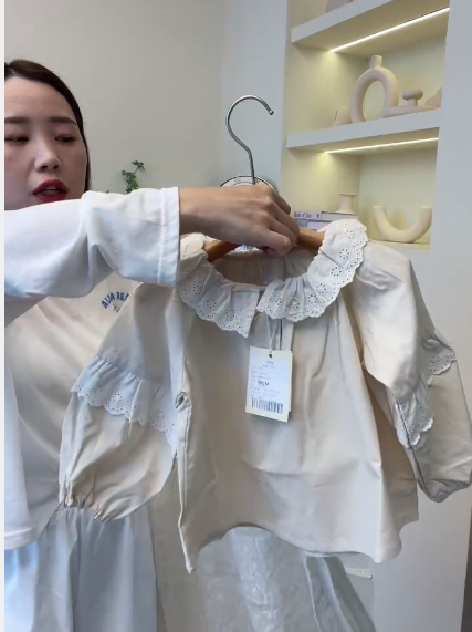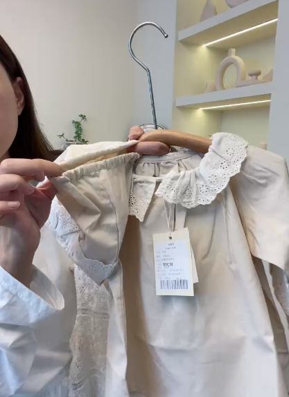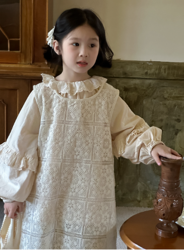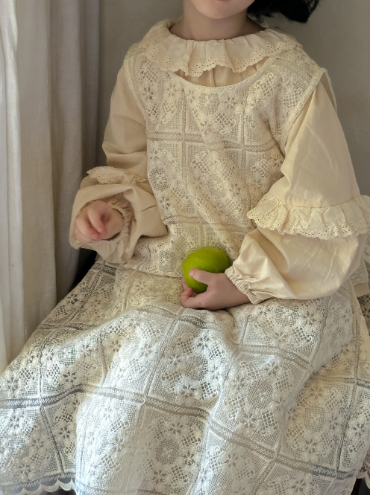 丸襟とフリル袖が愛らしく、特別な日のお出かけにぴったり。