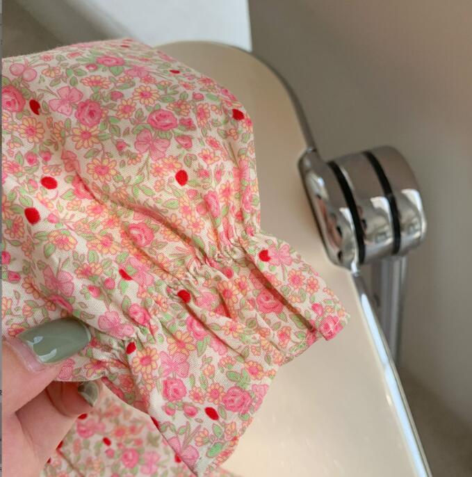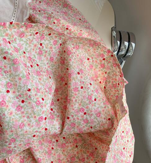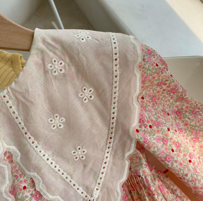 上品な白い襟と優しいピンクの花柄が女の子らしさを演出します。