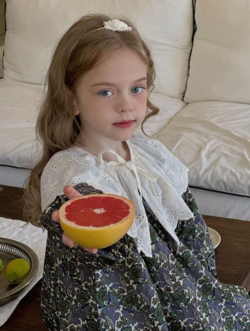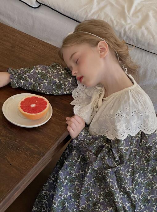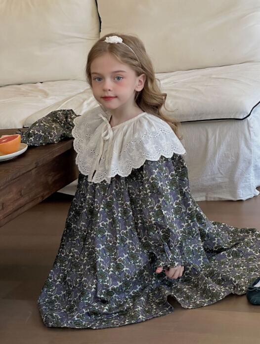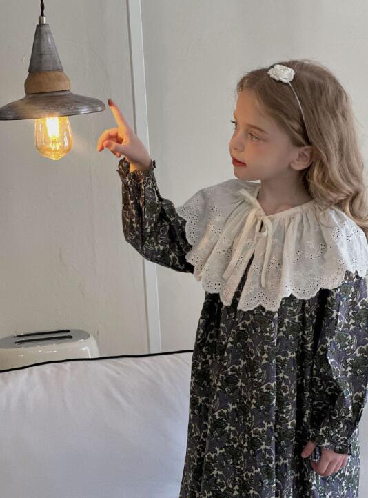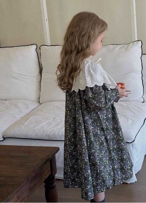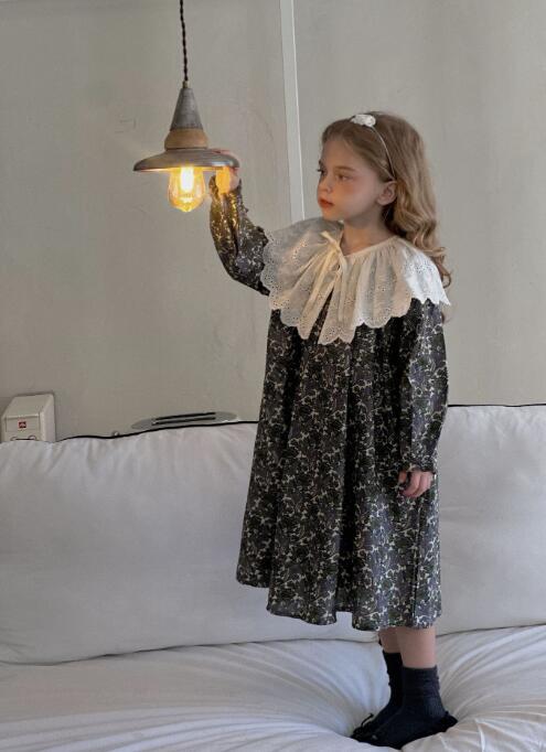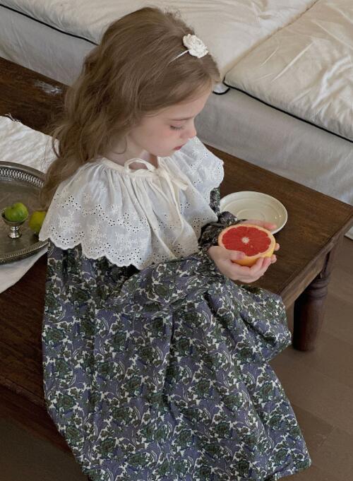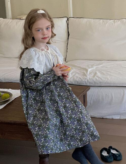 上品な白レースブラウスと花柄スカートが一体になったキッズ用ロングワンピース。