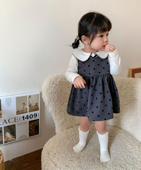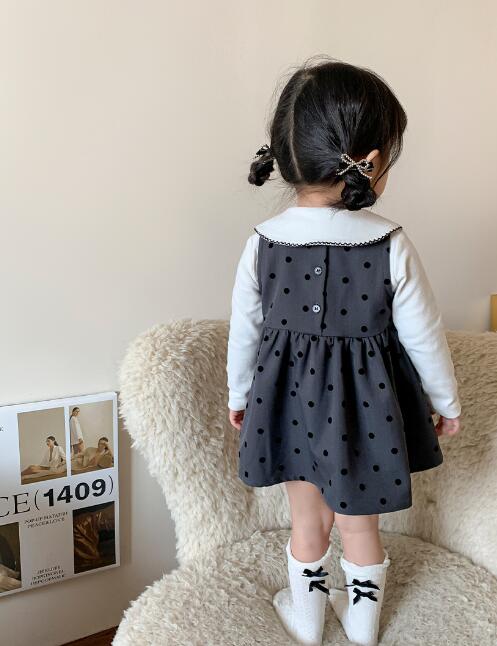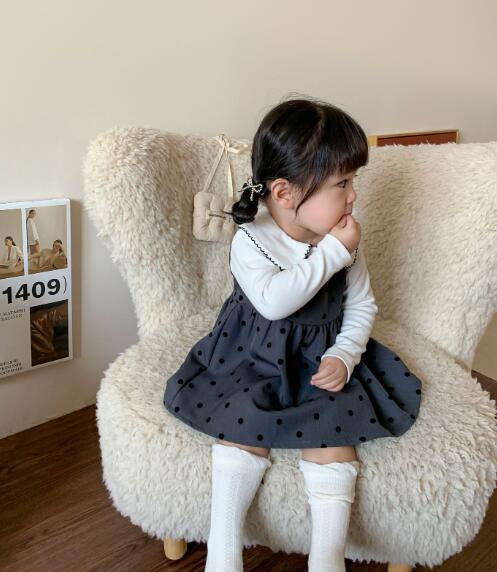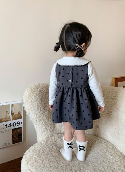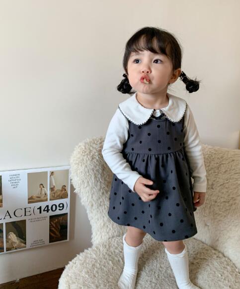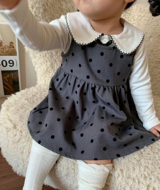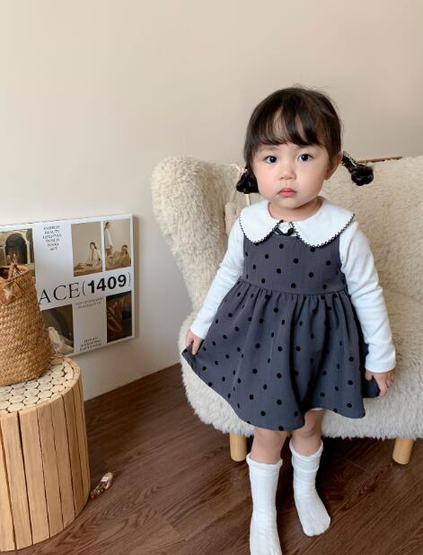 白い丸襟の長袖シャツと水玉柄のジャンパースカートの組み合わせで、