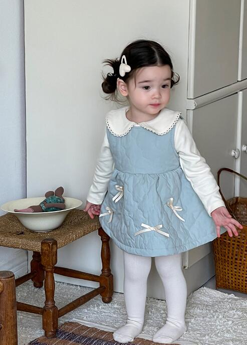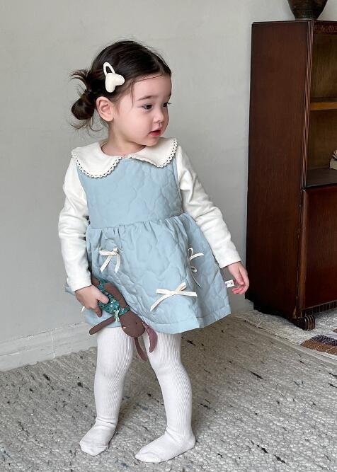 白い長袖の上着に淡い青色のワンピースを重ねた上品なデザイン。