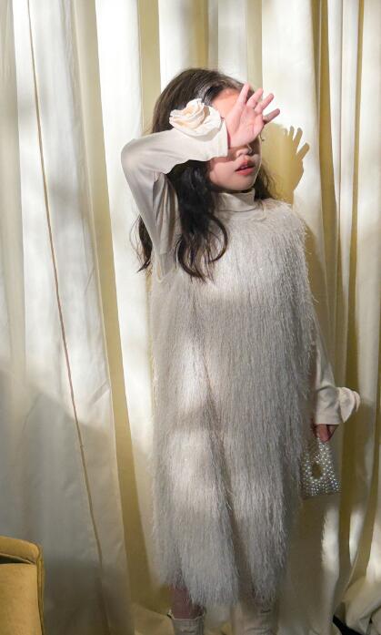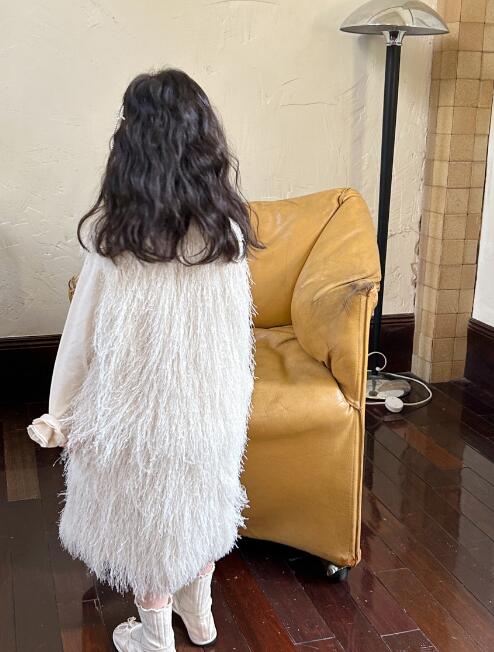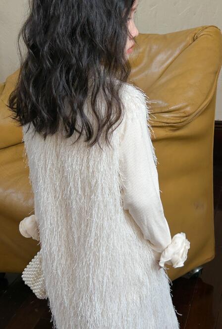 白いインナーとのレイヤードスタイルで、お出かけやお呼ばれにも最適。