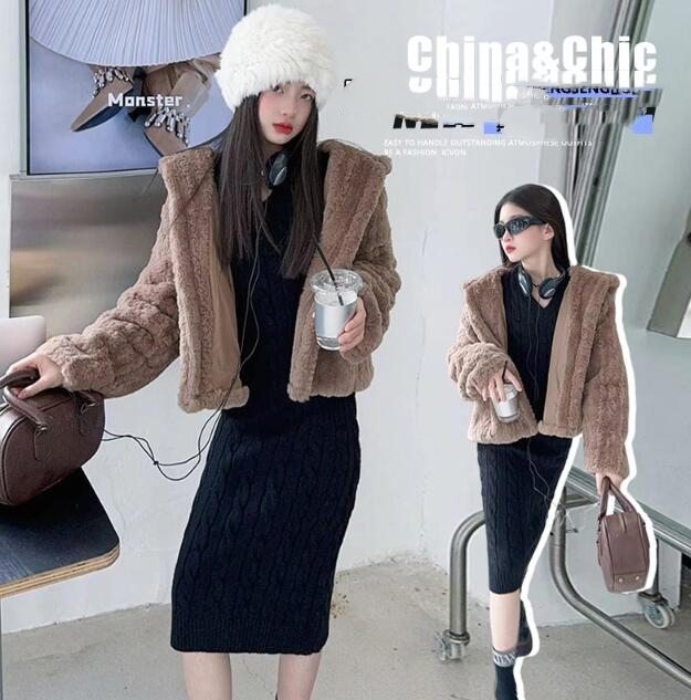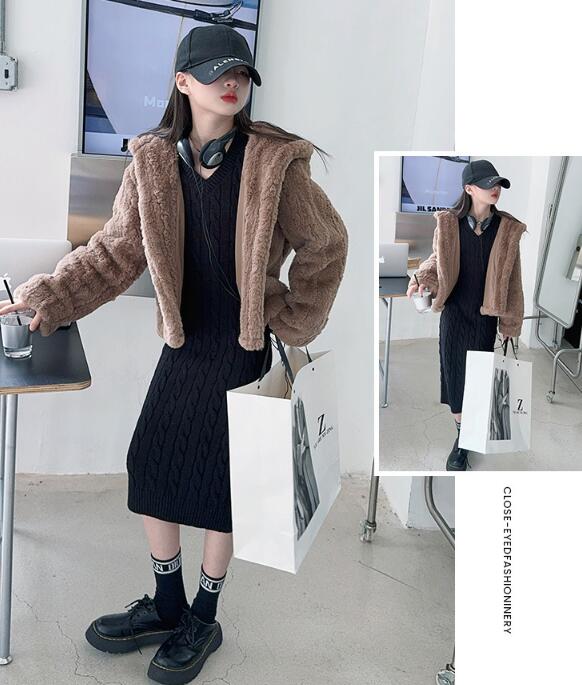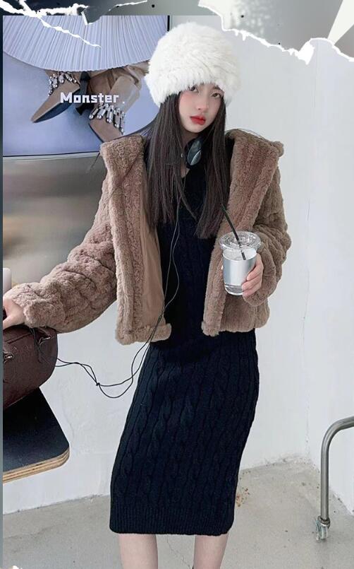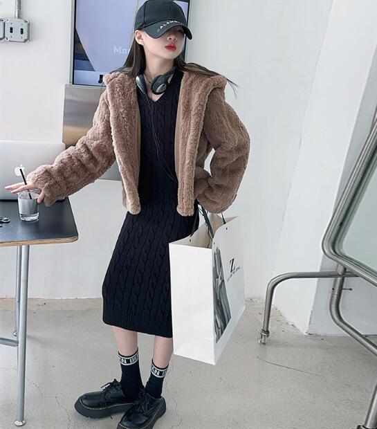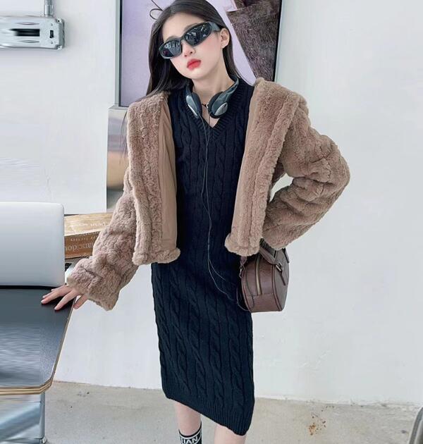 おしゃれなキッズ向けロングワンピースとボア上着の二点セット。