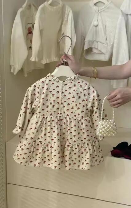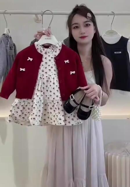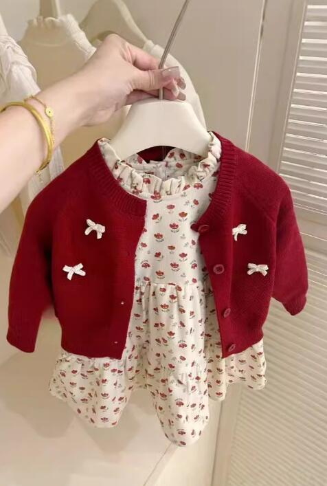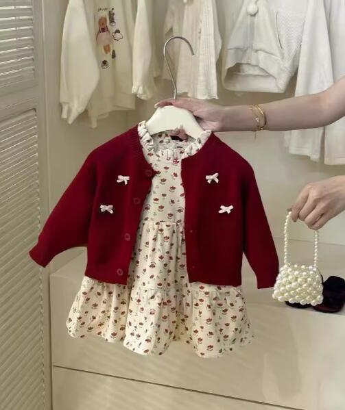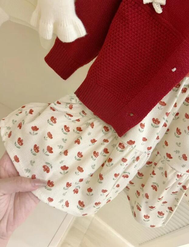可愛い花柄のキッズ用ロングワンピースと赤いニットカーディガンの二点セット。