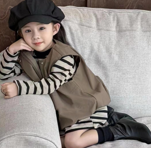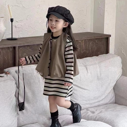 おしゃれなキッズ向けのベストとロングワンピースの二点組です。