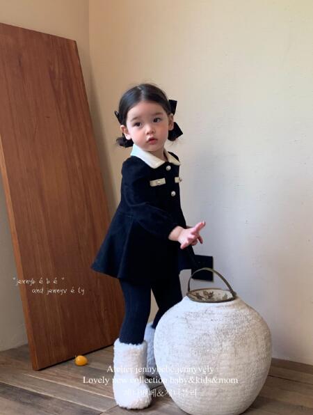 紺色のベルベット風素材に白い襟とボタンがアクセントの上品なデザイン。