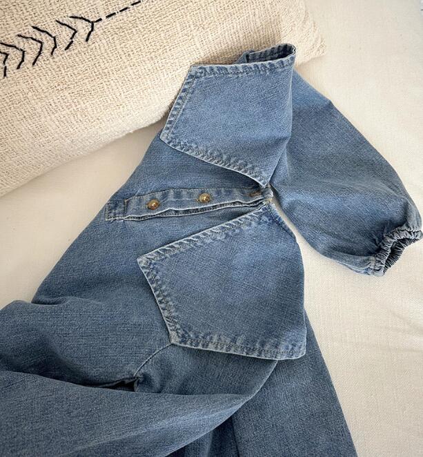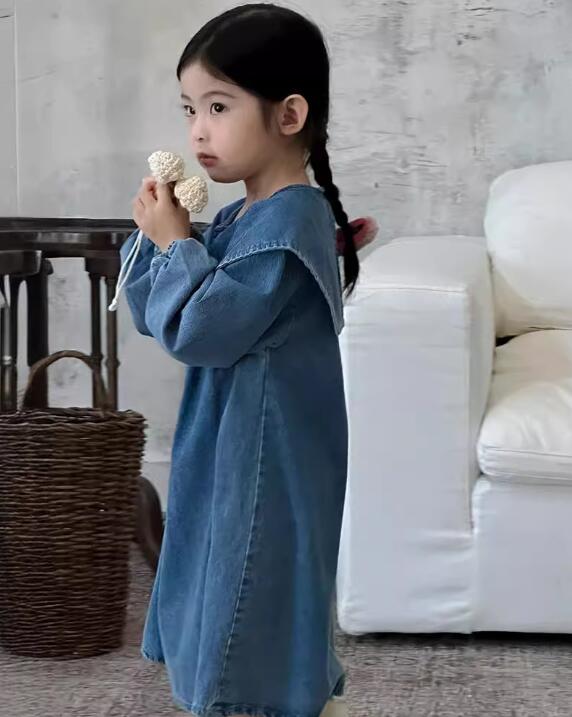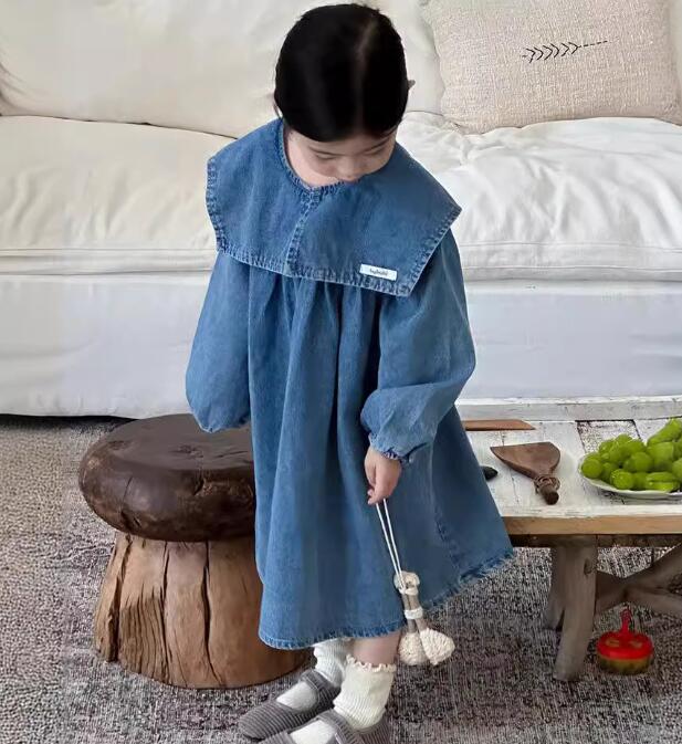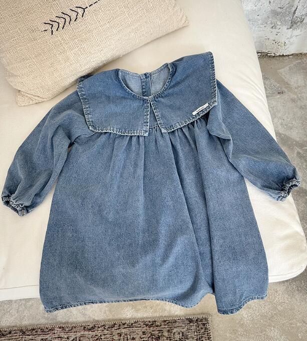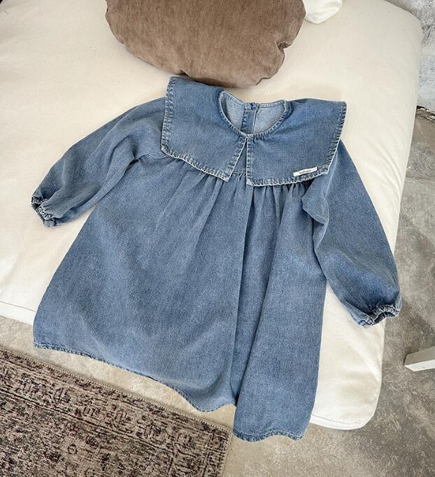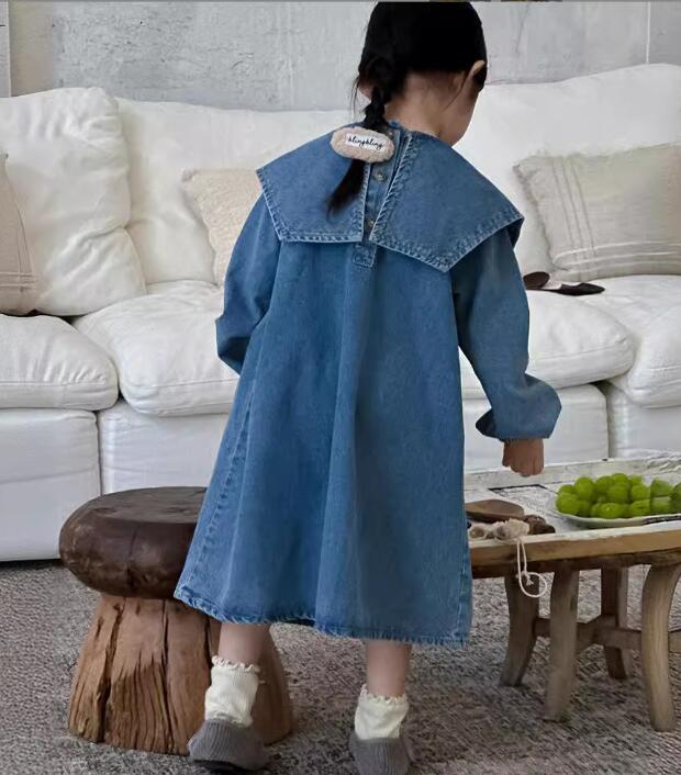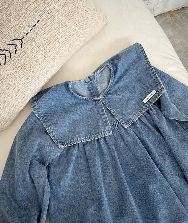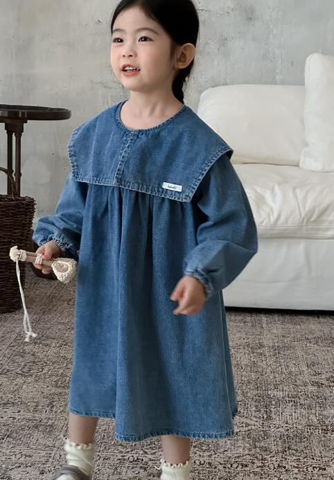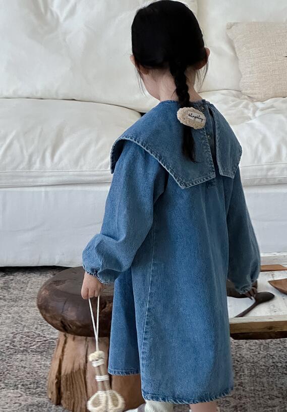 可愛い丸襟とゆったりシルエットが特徴のキッズ向けデニムロングワンピースです。