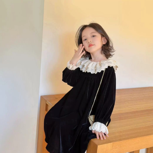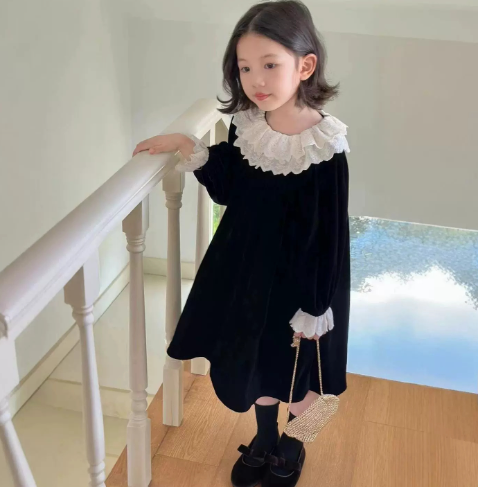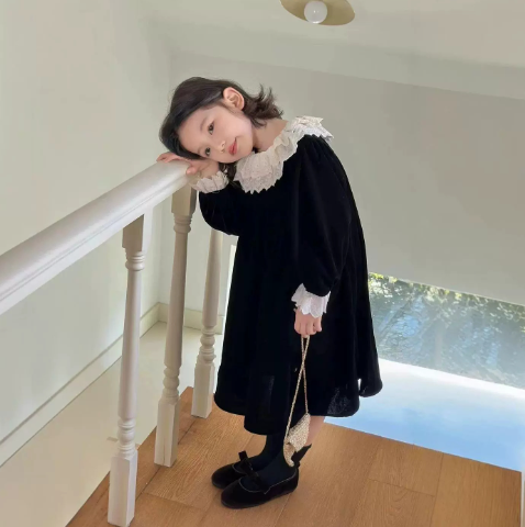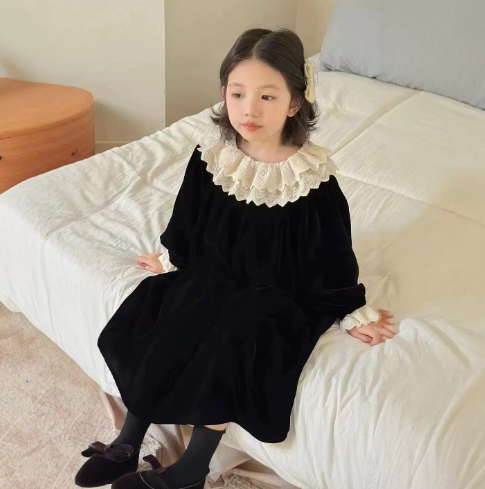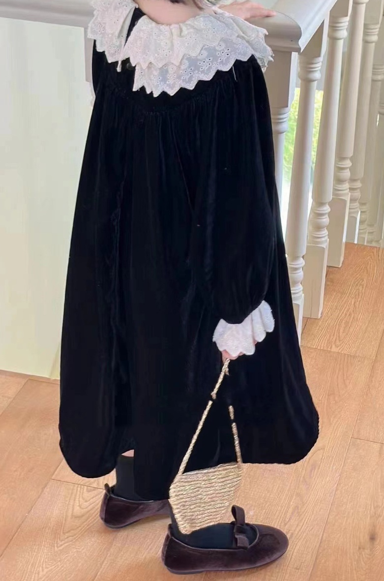 上品な白フリル襟と黒ベルベット風素材が特徴的なロングワンピースです。