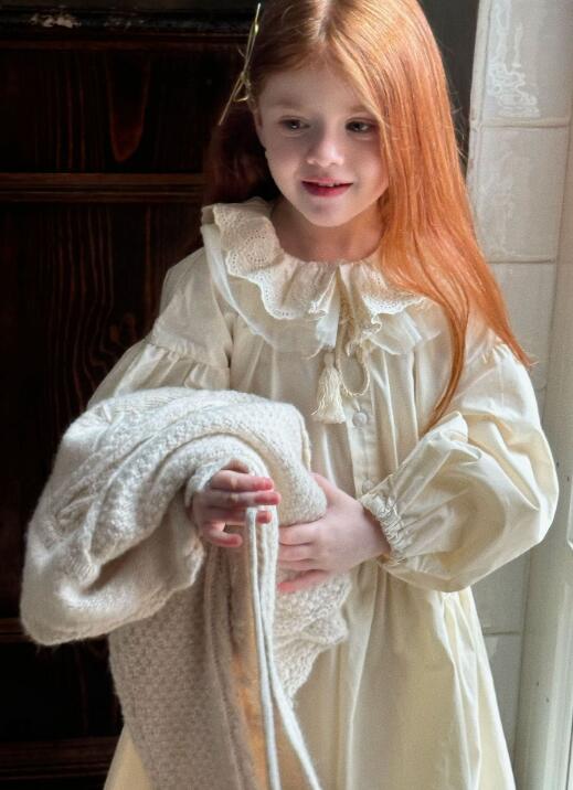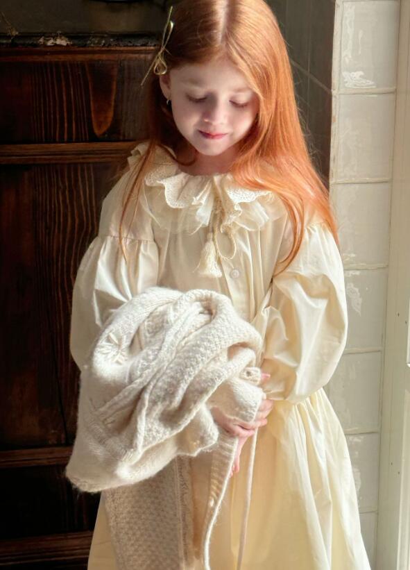 襟元の繊細なレース装飾とパフスリーブが可愛らしさを演出します。