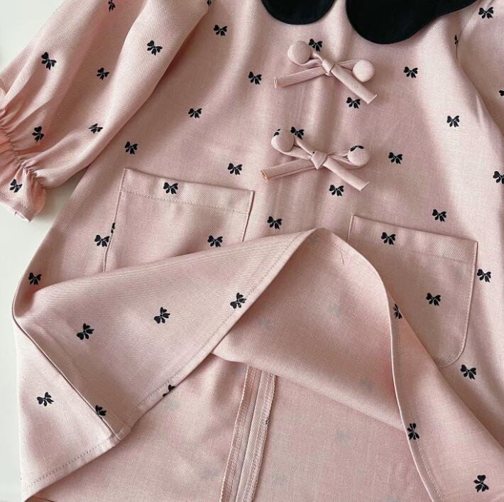 可愛いリボン柄と前面のボタン風装飾がポイント。