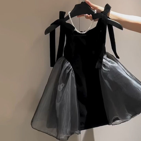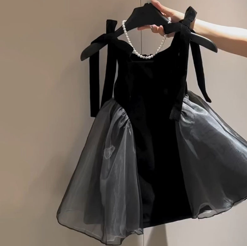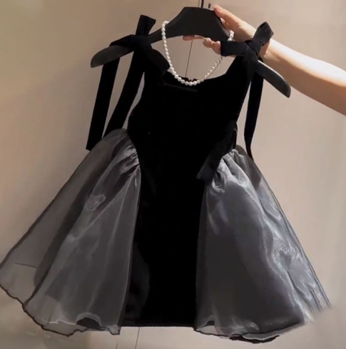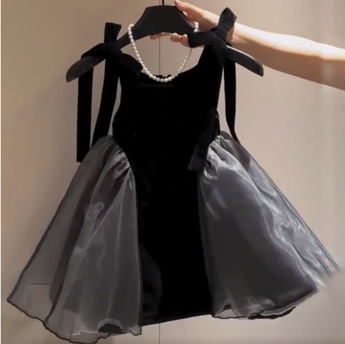 上品な黒のベルベット生地にグレーのチュール素材を組み合わせた華やかなデザインです。