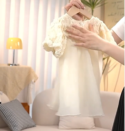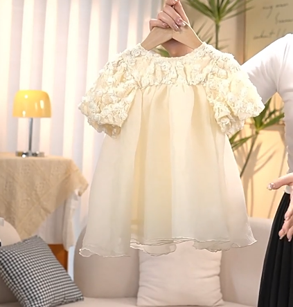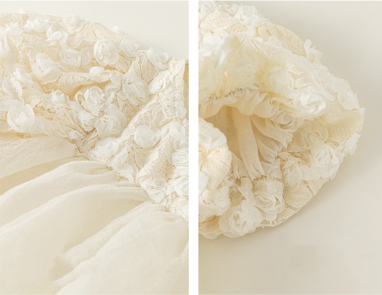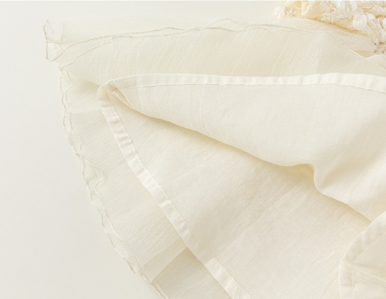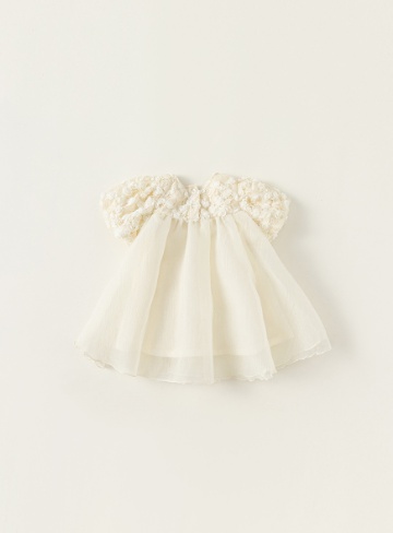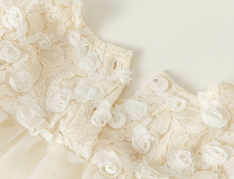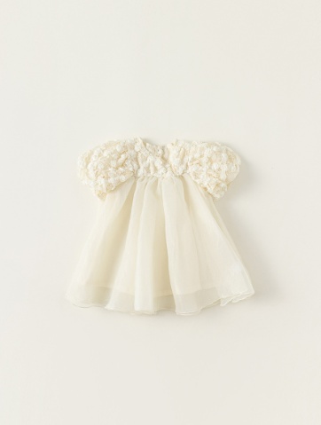 優しいクリーム色の生地に繊細な刺繍が施された、特別な日にぴったりの一着。
