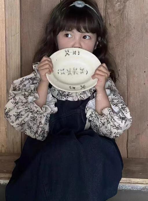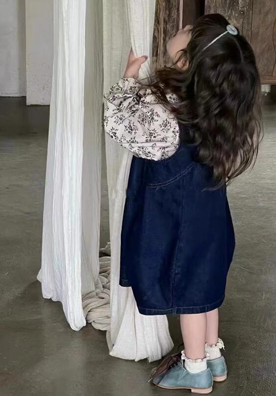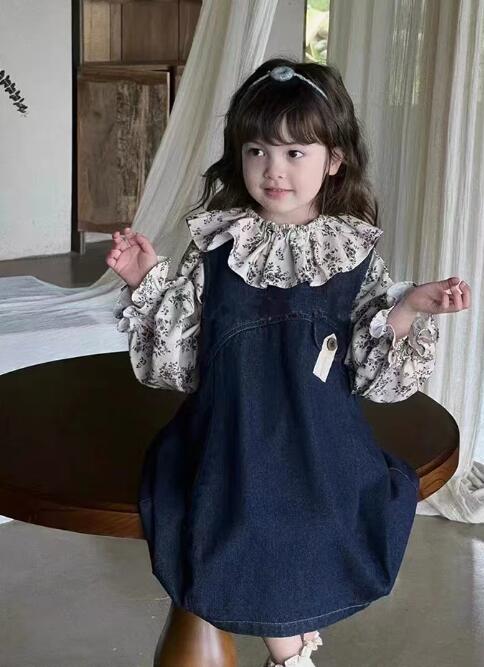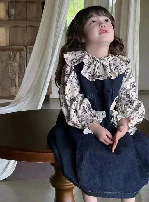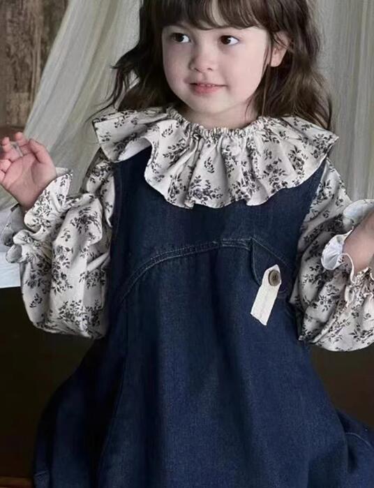 可愛らしい花柄の長袖シャツとデニムのロングワンピースのキッズ二点セットです。
