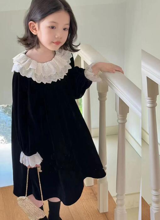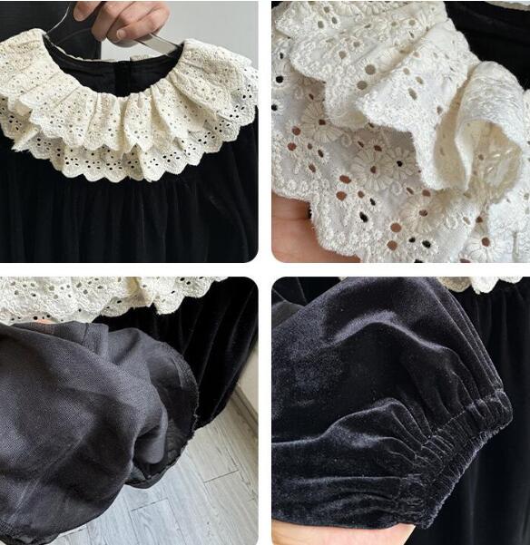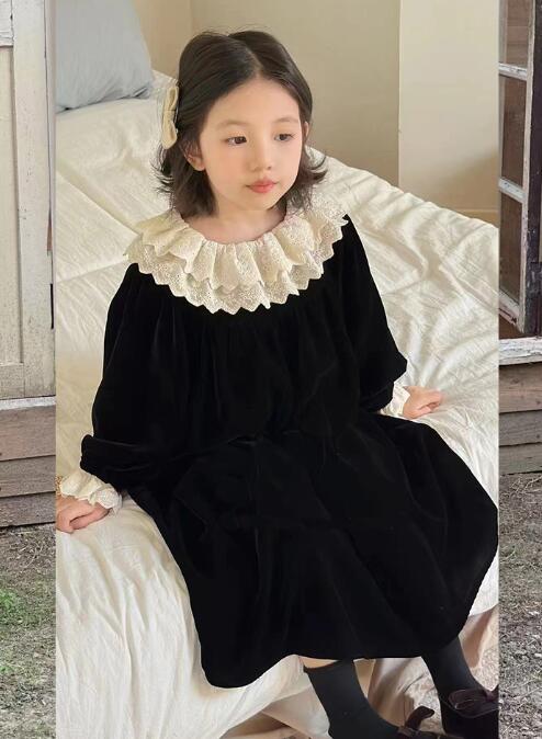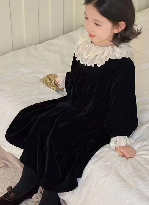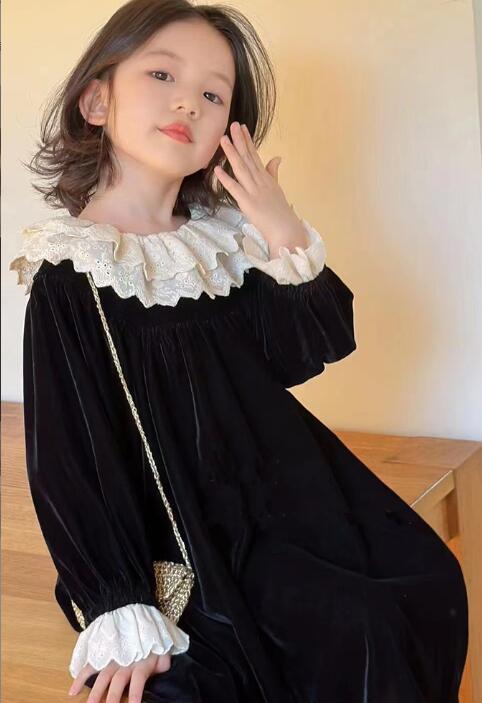 上品な白いフリル襟と袖口がアクセントの黒ベルベット素材キッズロングワンピース。