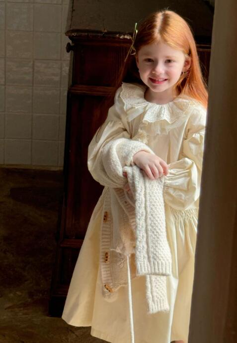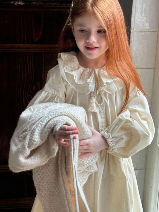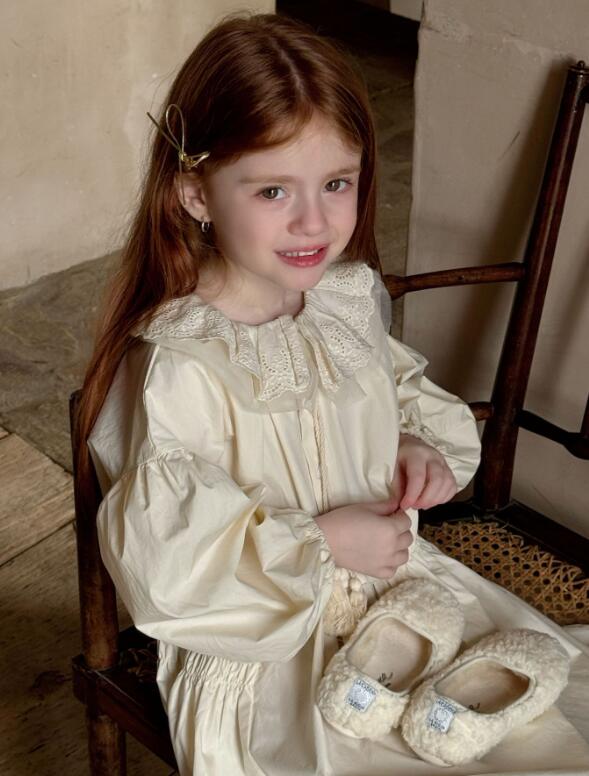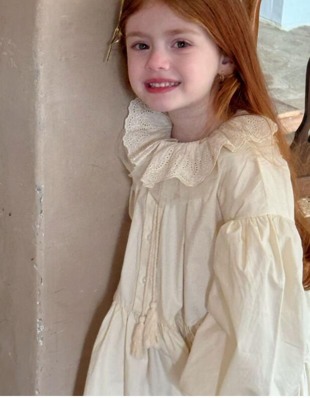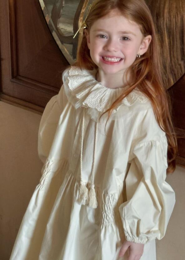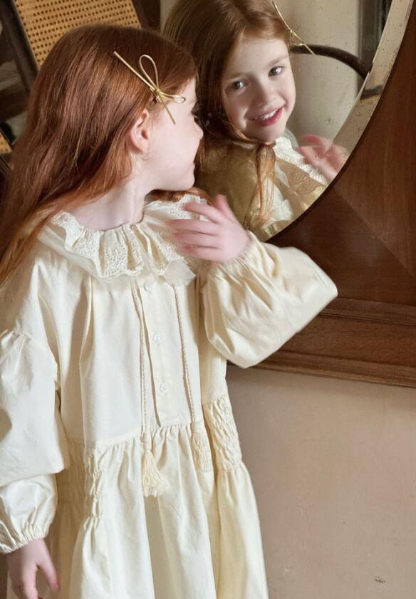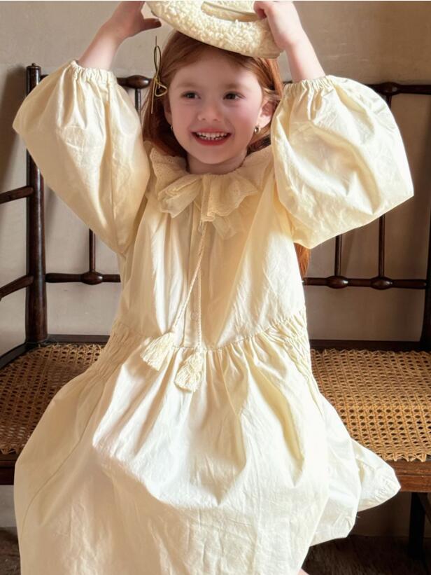 襟元と袖口の繊細なレース装飾がとても可愛らしく、パフスリーブとティアードスカートで女の子らしさを演出します。