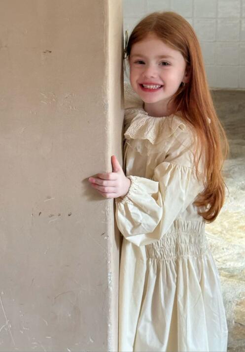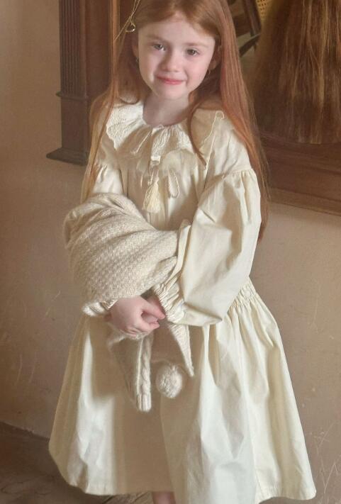 上品なクリーム色のキッズ用ロングワンピースです。