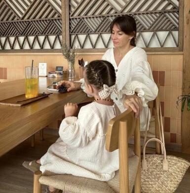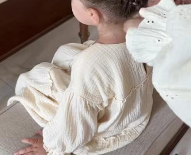 優しいクリーム色の生地にギャザーをたっぷり使った、女の子らしいデザインです。