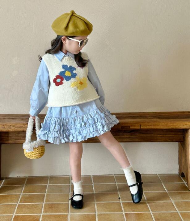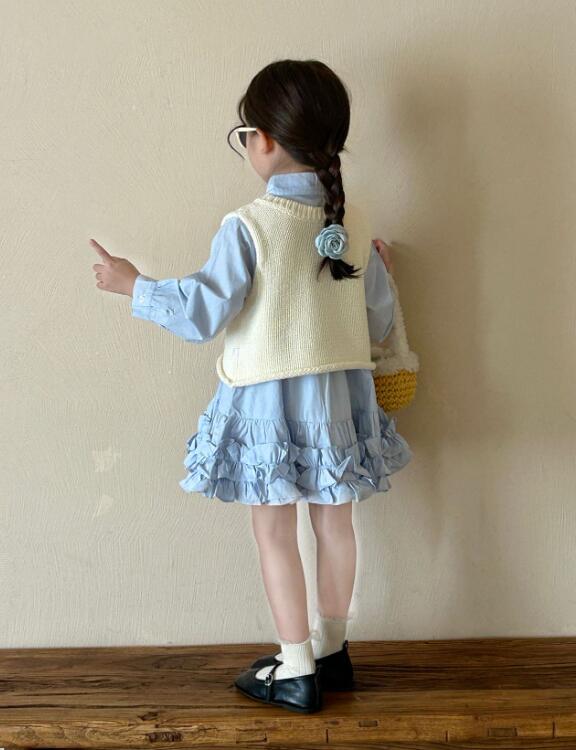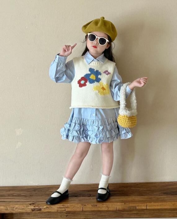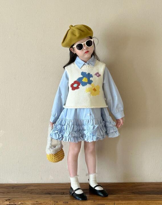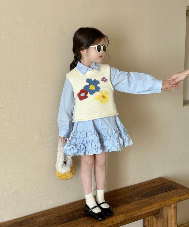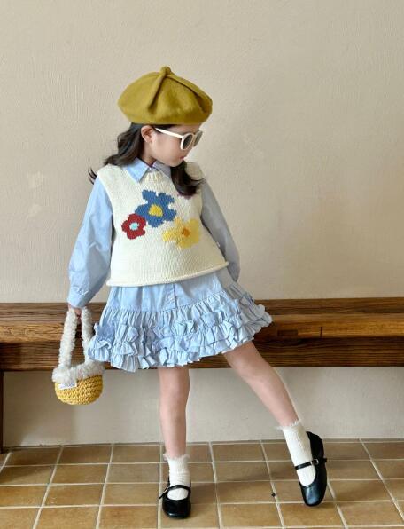 可愛い花柄編みベストとシャツワンピースのキッズ二点セットです。