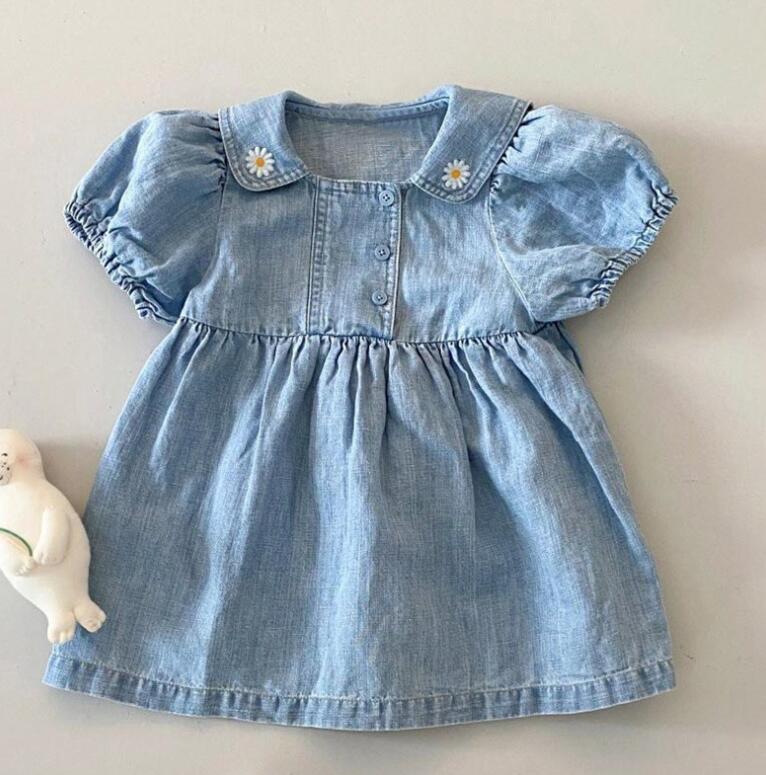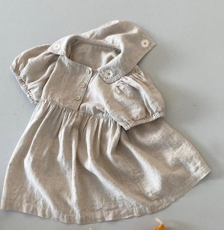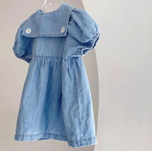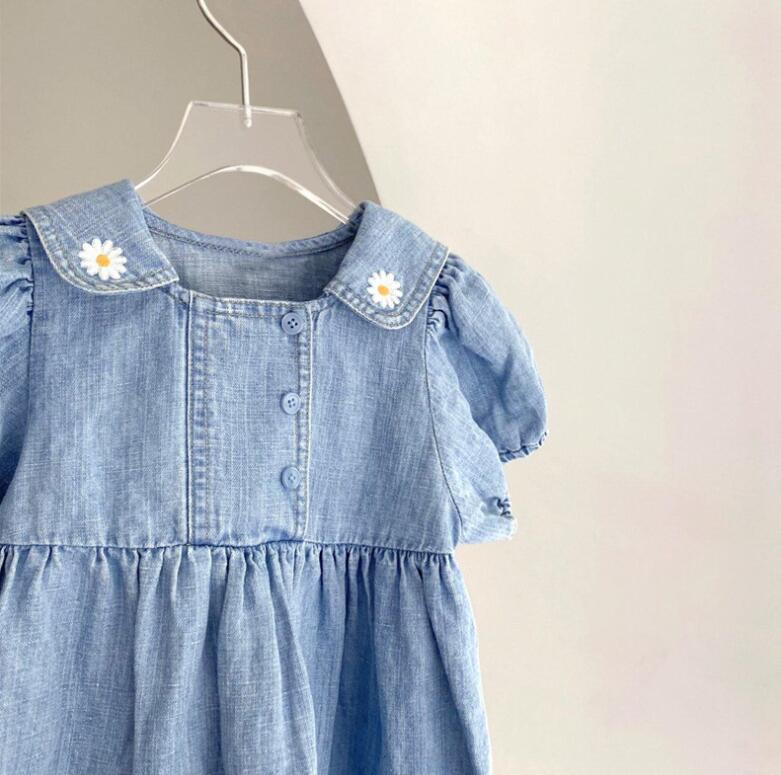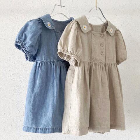 可愛らしい花の刺繍が施された襟が特徴的なキッズ向けワンピースです。