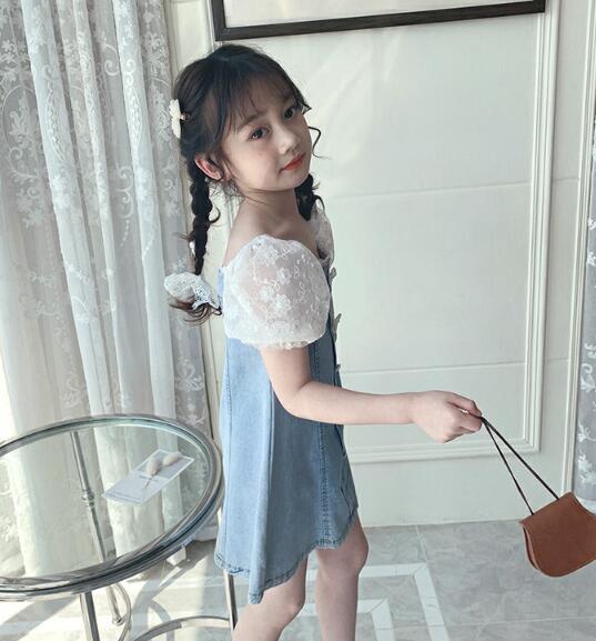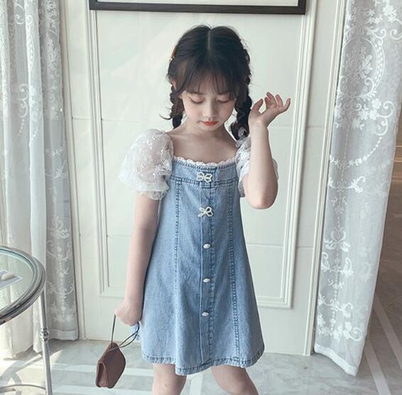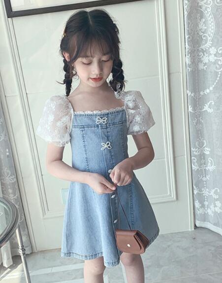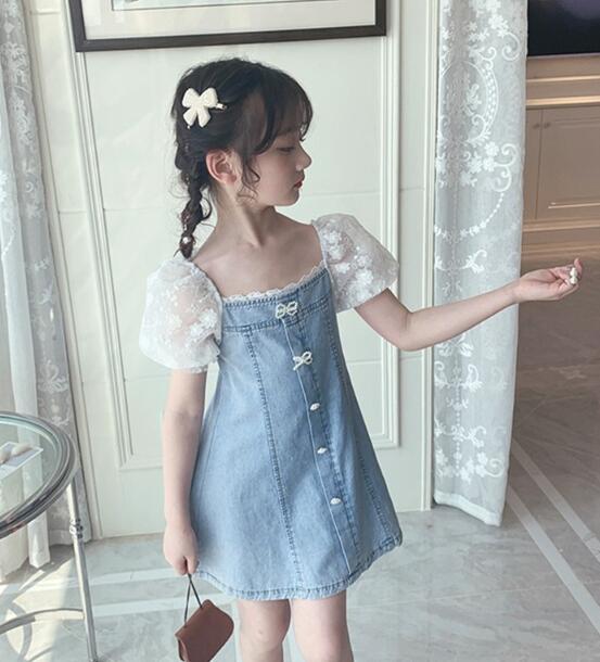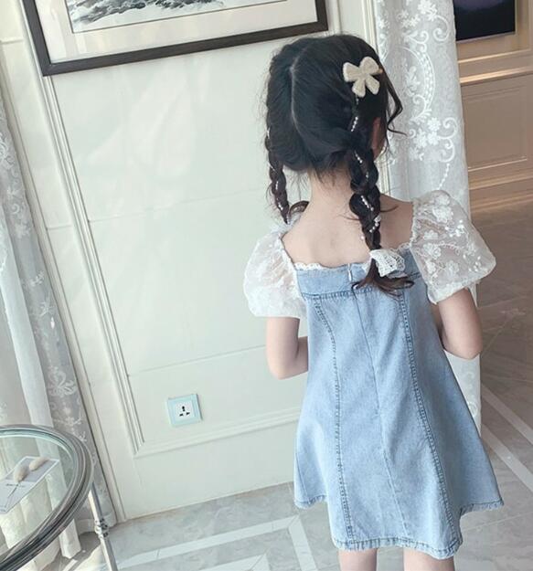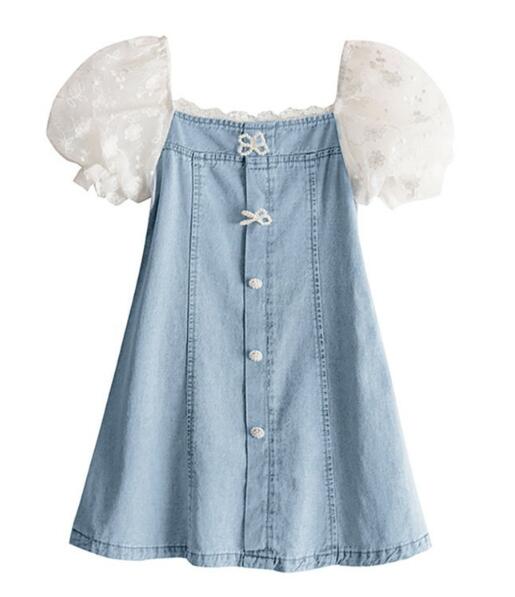 可愛いキッズ向けデニムワンピースが登場! 白いレース袖がとても上品で、お出かけにぴったりです。 ロングワンピースタイプで体型カバーも◎ リボンモチーフのボタンがアクセントになった 女の子らしいデザインです。