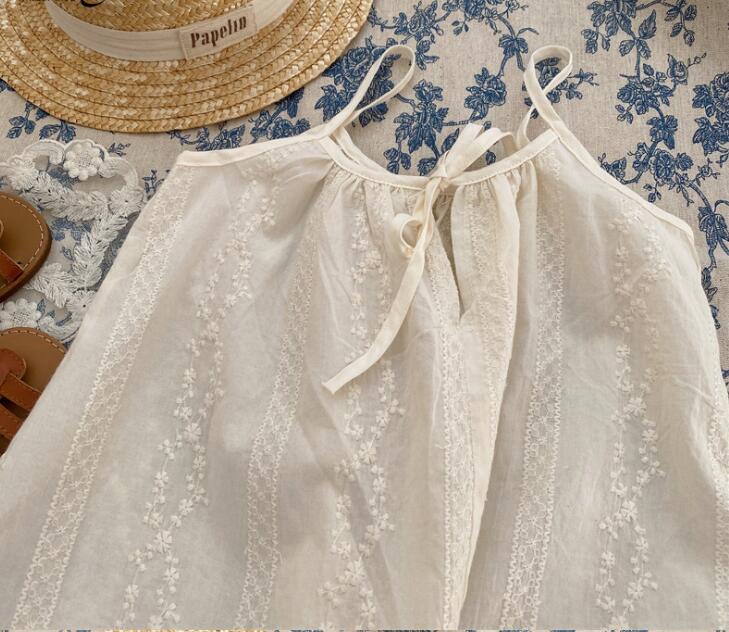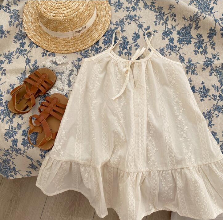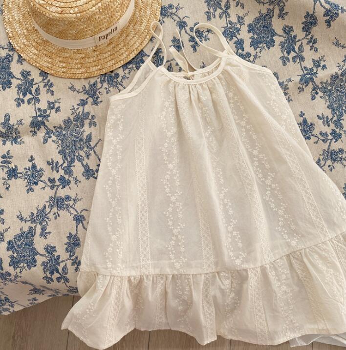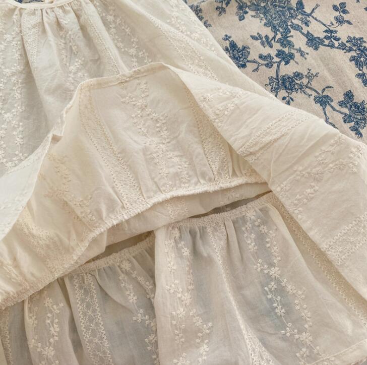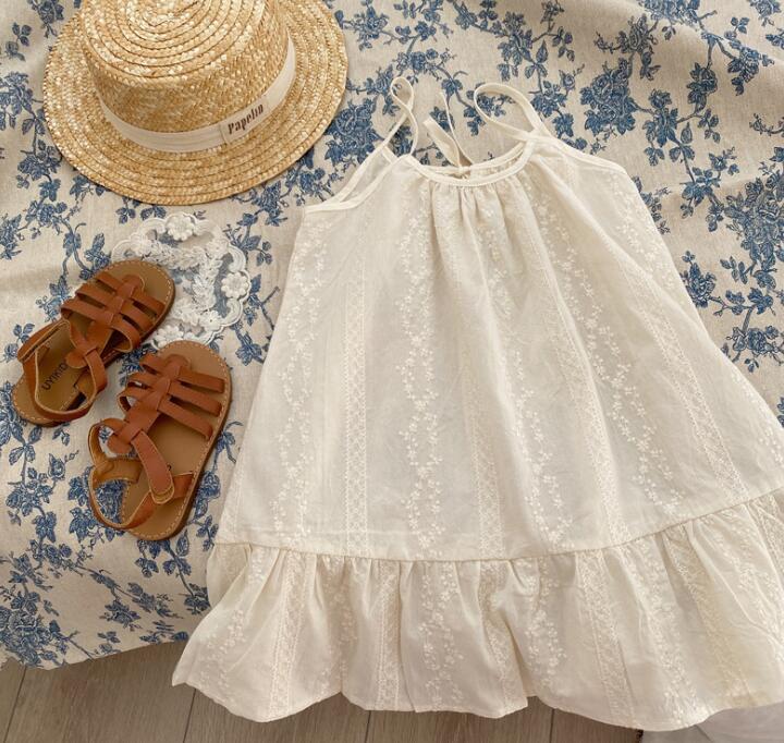 細かな刺繍模様と裾のフリルデザインが可愛らしく、特別な日のお出かけにぴったりです。